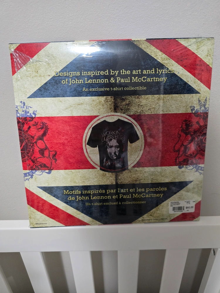 This is an exclusive t-shirt collectible featuring designs inspired by the art and lyrics of John Lennon and Paul McCartney. It's still in its original packaging and ready for a new owner!