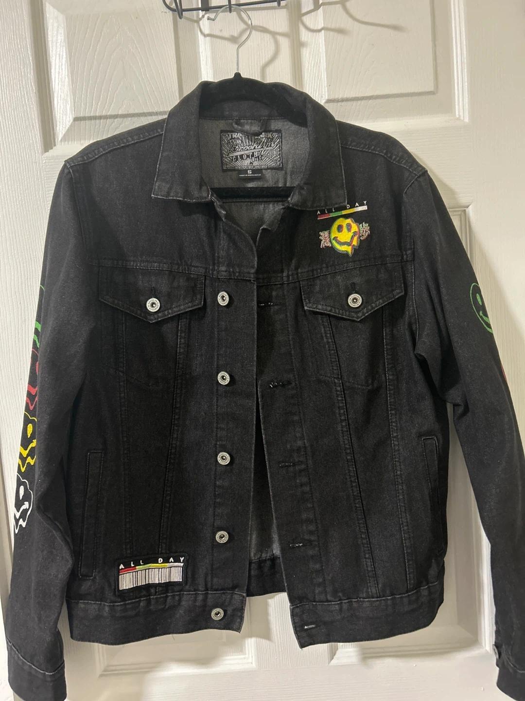Selling a cool black denim jacket with a 'Drip All Day' design on the back and sleeves! It features a unique graphic with a melting smiley face and vibrant colors. The jacket is in great condition and ready for a new owner