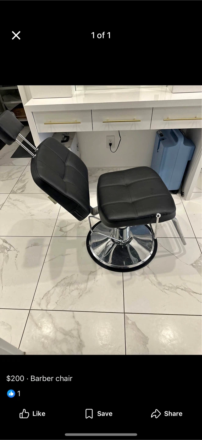 Selling a black barber chair in good condition. It's a sturdy chair with a chrome base and comfortable seat. Perfect for a home salon or barber shop!