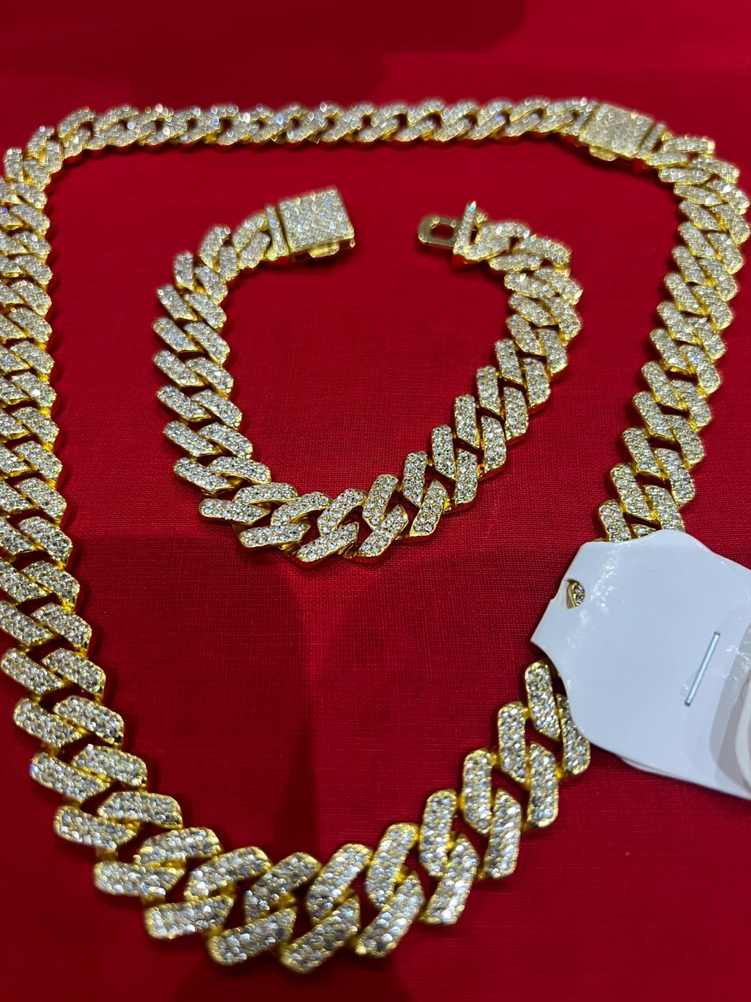 Selling a gold stylish Cuban link chain and bracelet set. The set features a classic design that adds a touch of bling to any outfit. Perfect for those who appreciate a bit of shine!