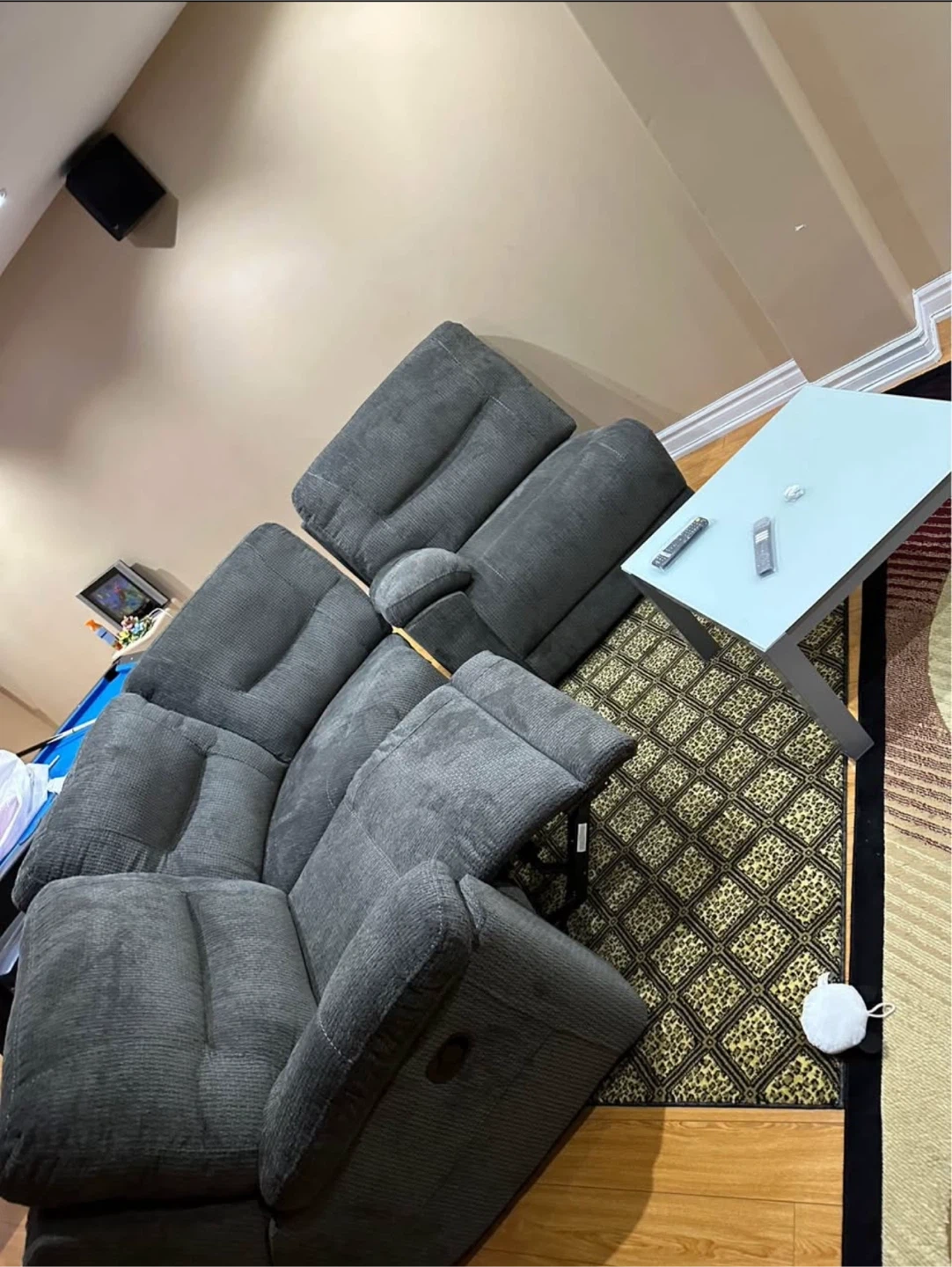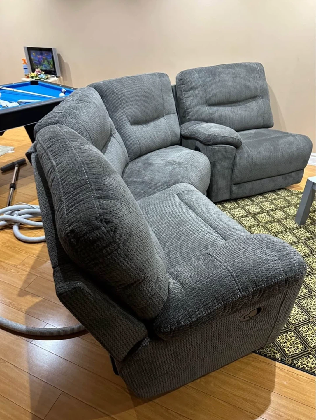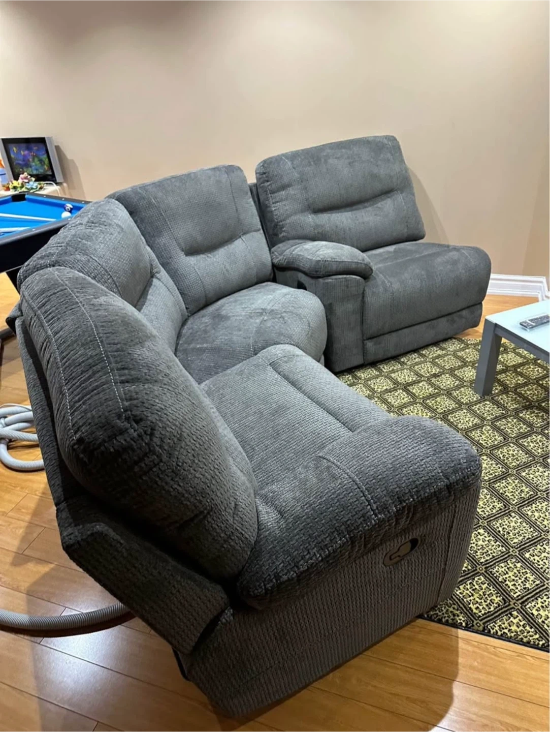 Selling a comfy grey reclining sectional sofa! It's perfect for a family room or a basement. It has a nice, soft fabric. It is in good condition and ready for a new home!