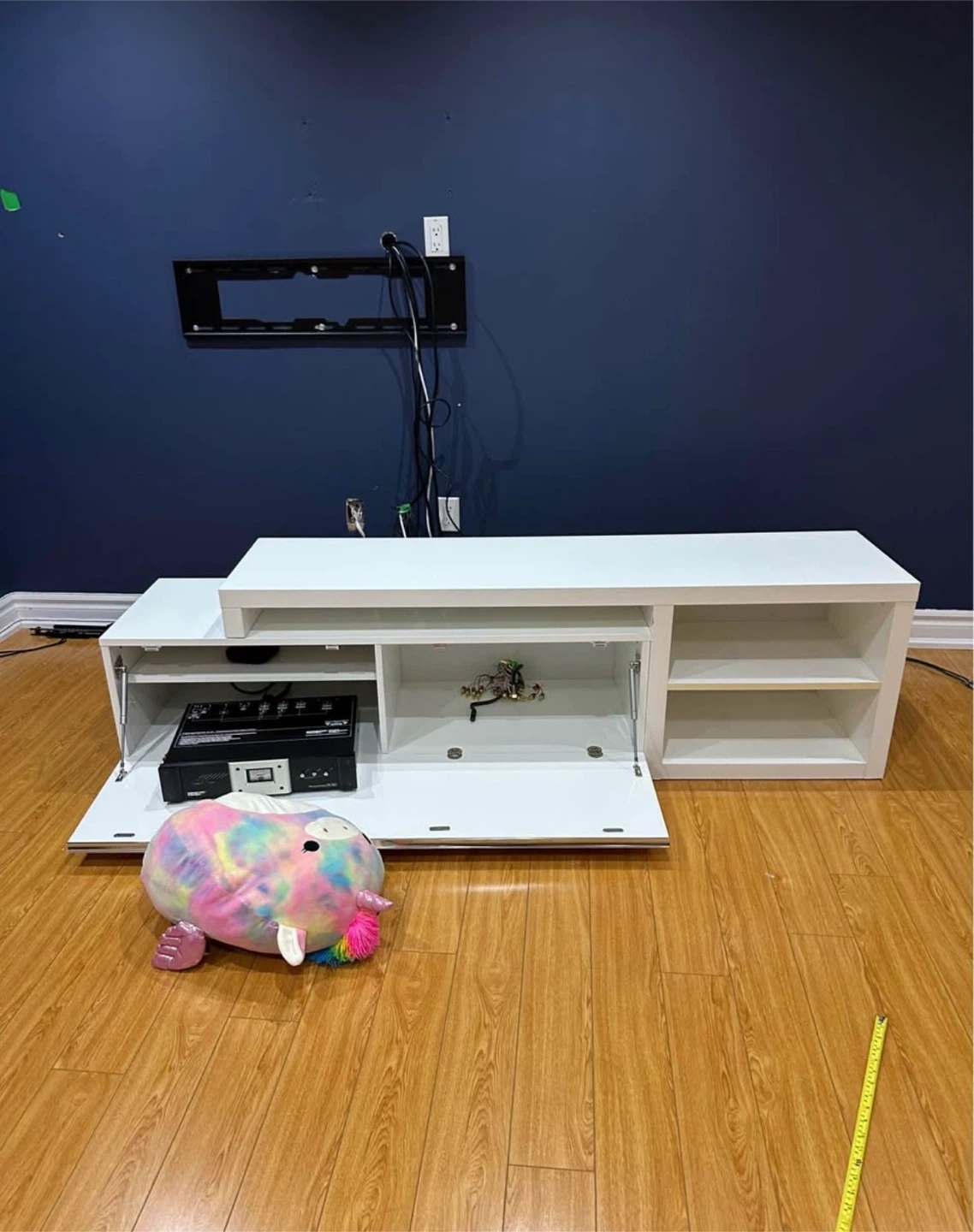 Selling a white TV stand or media console. It's in great shape and ready to hold your TV and media devices. The stand measures approximately 63 inches in length and 17 inches in height. It features storage compartments with doors and open shelves for your convenience