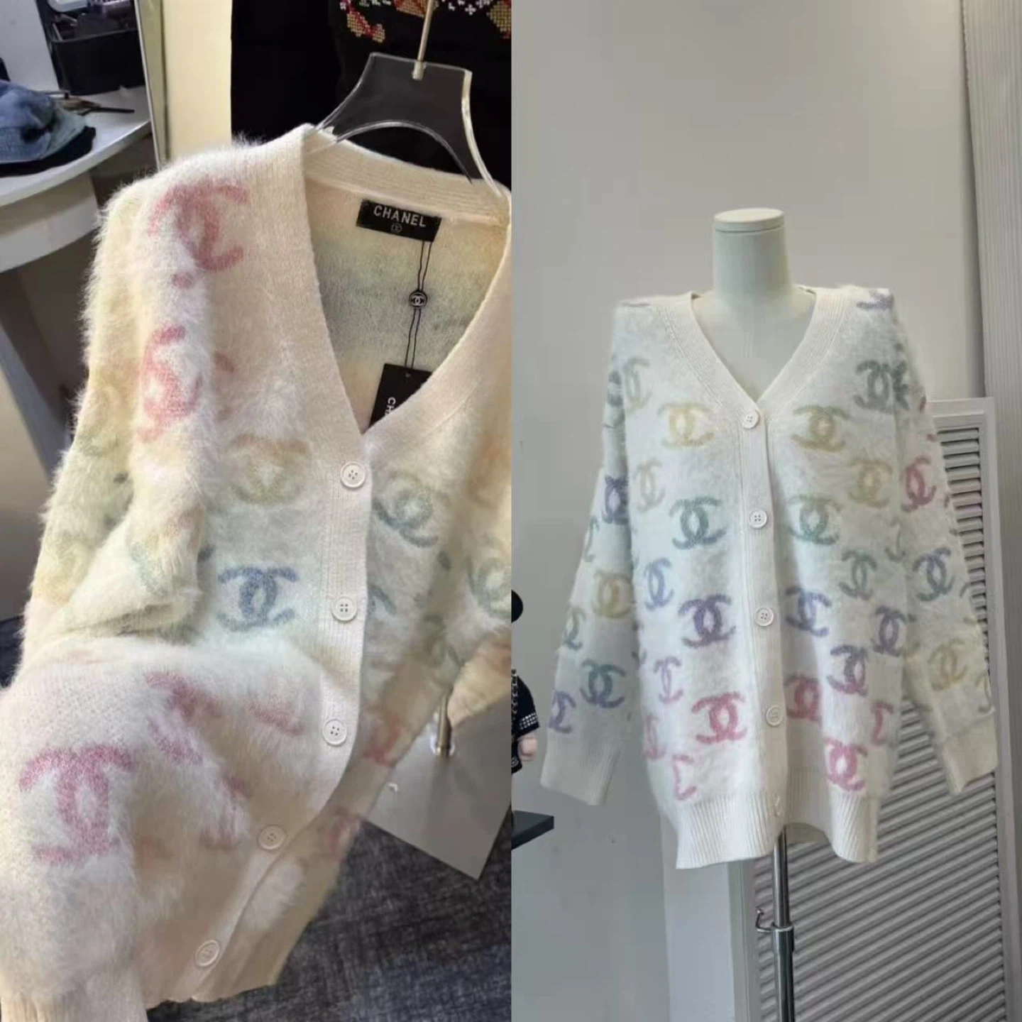 Here's a lovely Chanel cardigan! It features the iconic Chanel logo in pastel colours all over. It's in great condition and ready to add a touch of luxury to your wardrobe