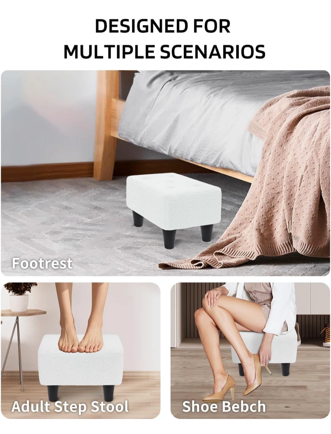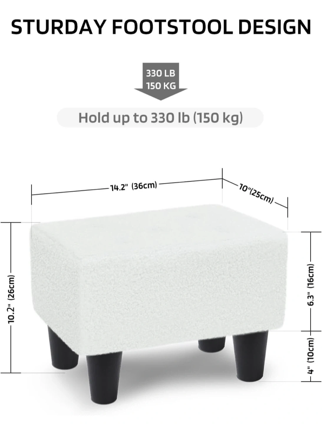 This ottoman foot stool is brand new in packaging and ready to add a touch of comfort and style to your living space, featuring a soft teddy fur cover and sturdy plastic legs! It is perfect as a footrest, shoe bench, or extra seating. Dimensions are 14.2" x 10" x 10.2" and can hold up to 330lbs.