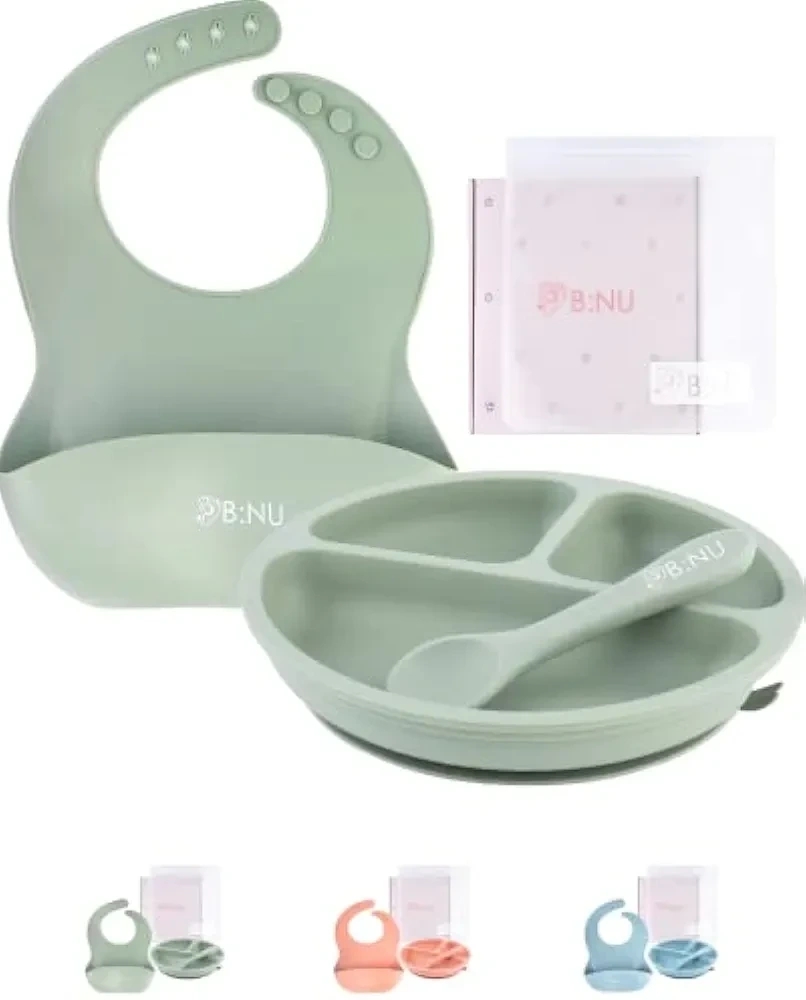 This BNU Eco Friendly Baby Feeding Set is brand new and comes in its original box! It's designed to be easy to clean and stain-resistant, and is also microwave and freezer friendly, as well as dishwasher safe. The set is made with premium quality materials, including luxurious 100% premium silicone, and is certified BPA, BPS, phthalate, and lead-free. It's also portable and compact, perfect for encouraging self-feeding!