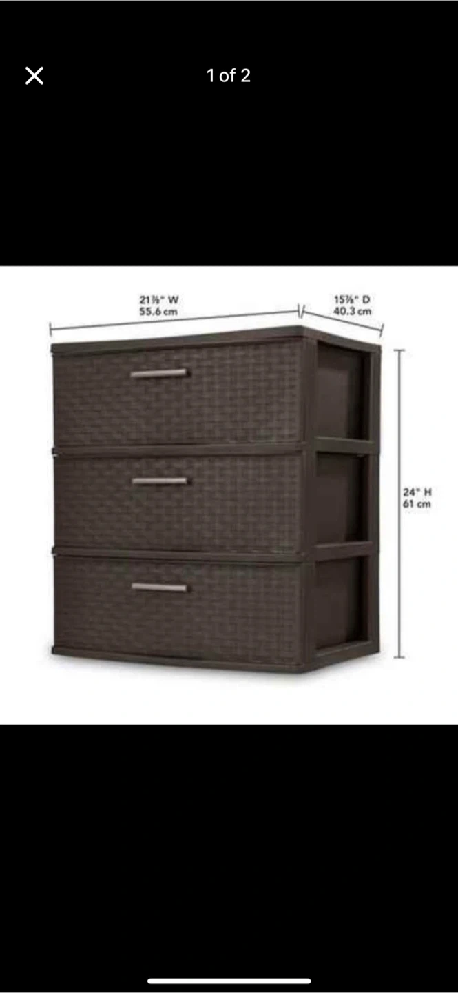 Selling a brown 3-drawer wide weave tower. It's perfect for adding extra storage to any room. The dimensions are 21 1/2" W (55.6 cm) x 15 3/4" D (40.3 cm) x 24" H (61 cm)