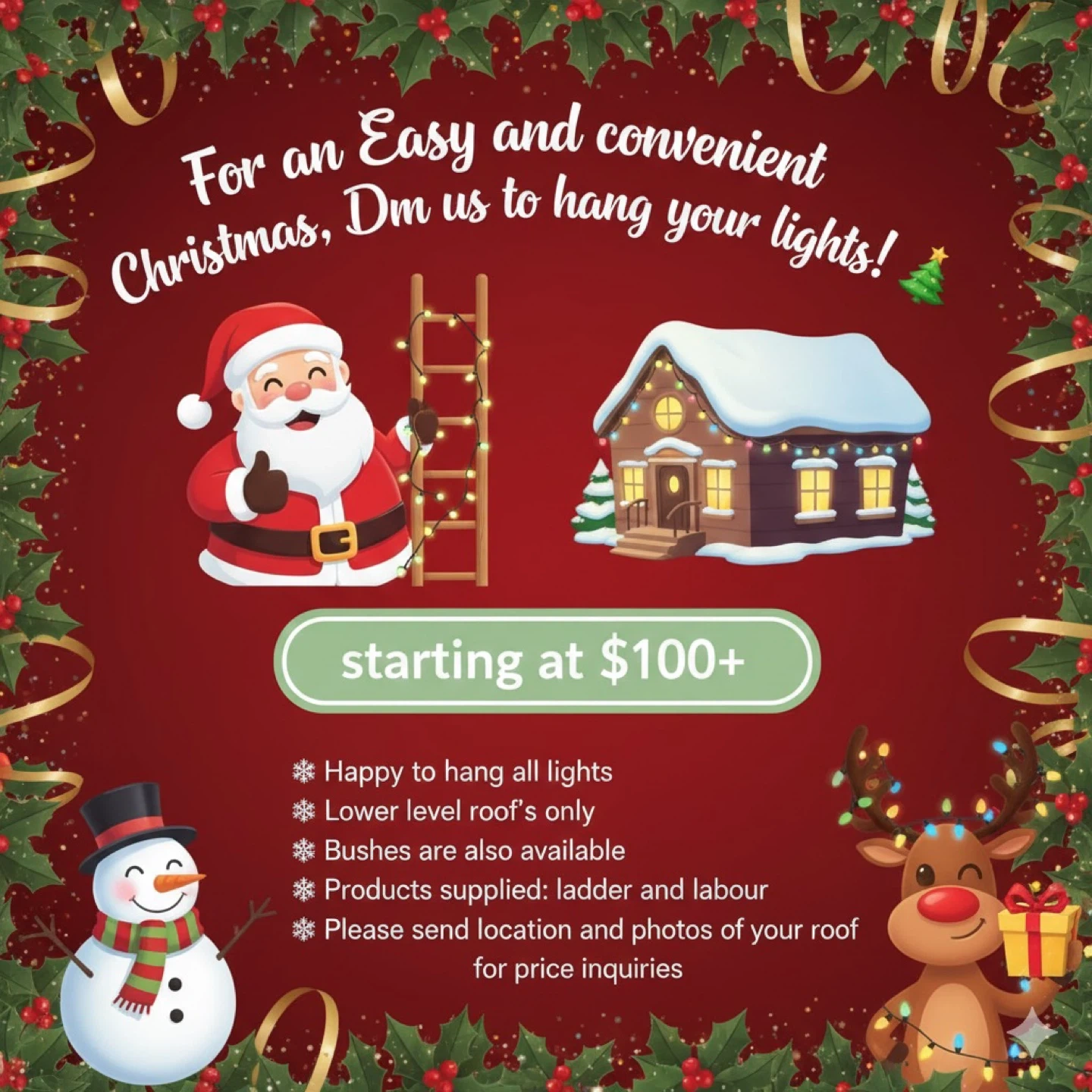 Get your Christmas lights hung easily and conveniently! Services start at $100+ and include ladder and labour. Happy to hang all lights on lower level roofs, and bushes are also available. Please send location and photos of your roof for price inquiries