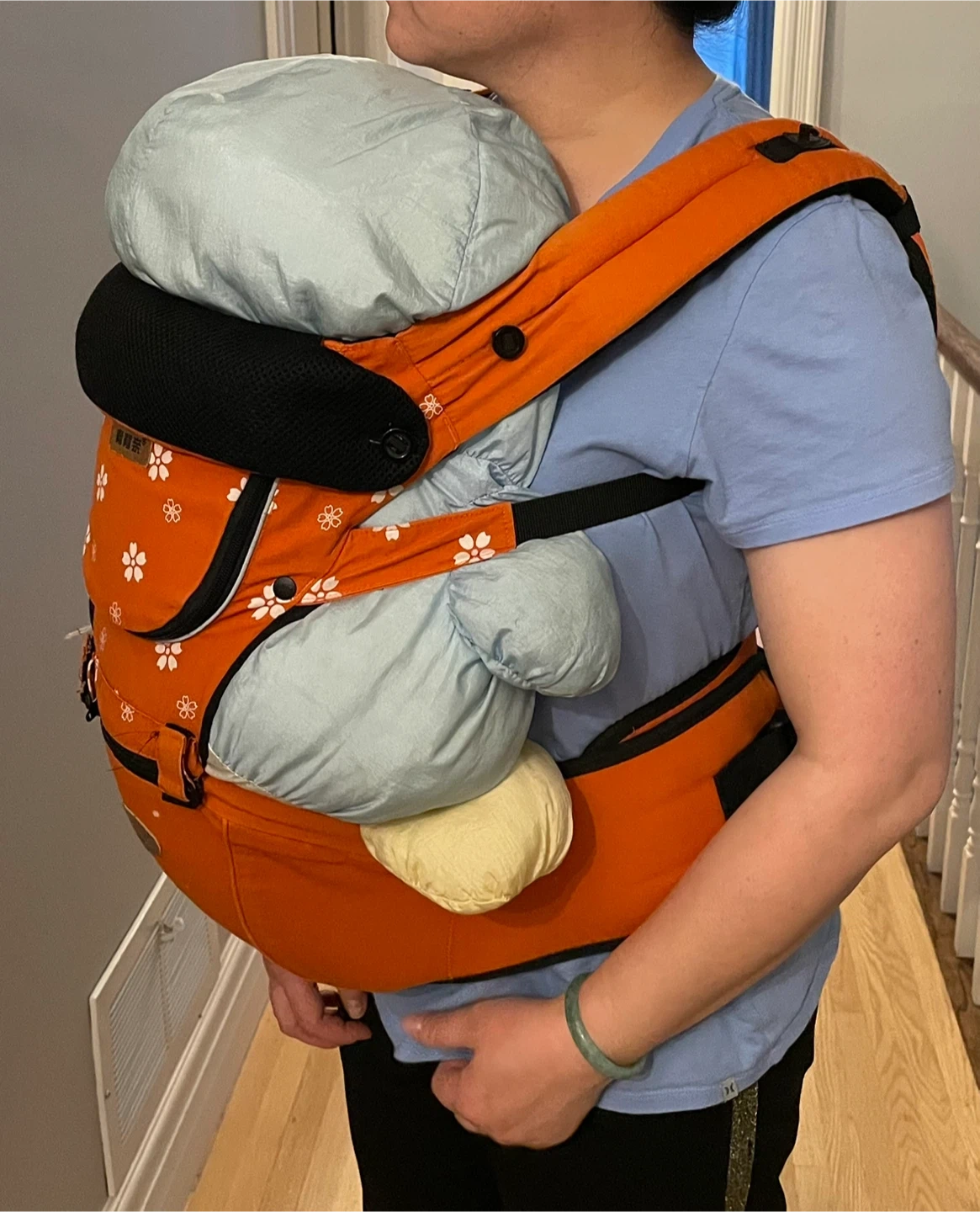 Selling an orange baby carrier. It's in good condition and ready to help you carry your little one comfortably!
