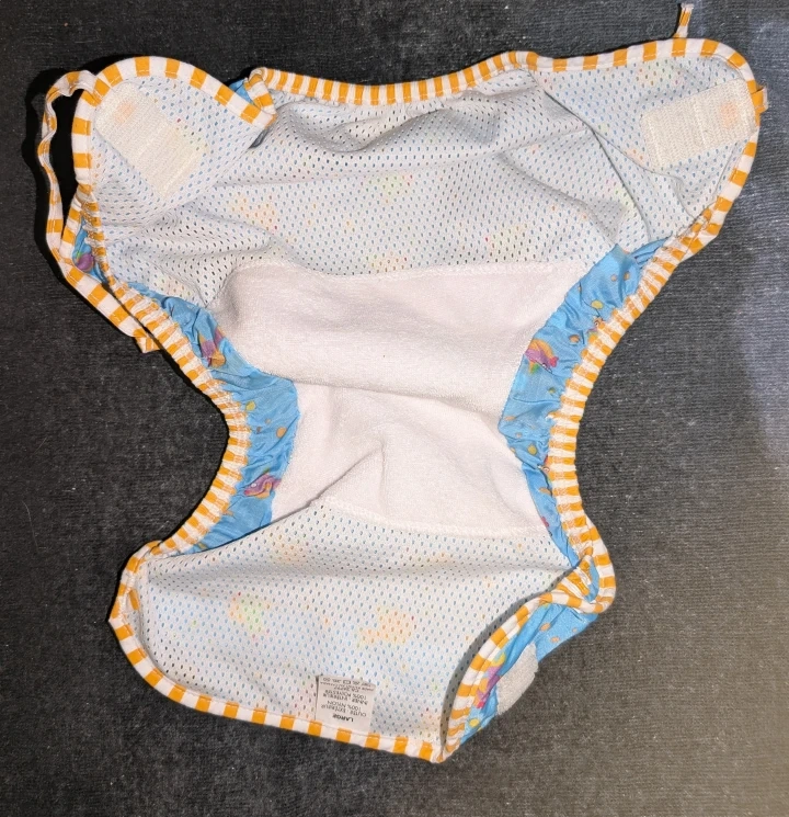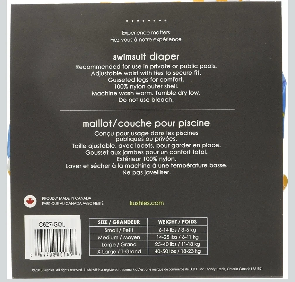 Unisex Kushies baby brand swimsuit diaper. Size large, fits 25-40 pounds (11-18kg). Ajustable waist with ties to secure fit. Gusseted legs for comfort. 100% nylon outer shell. Made in Canada.