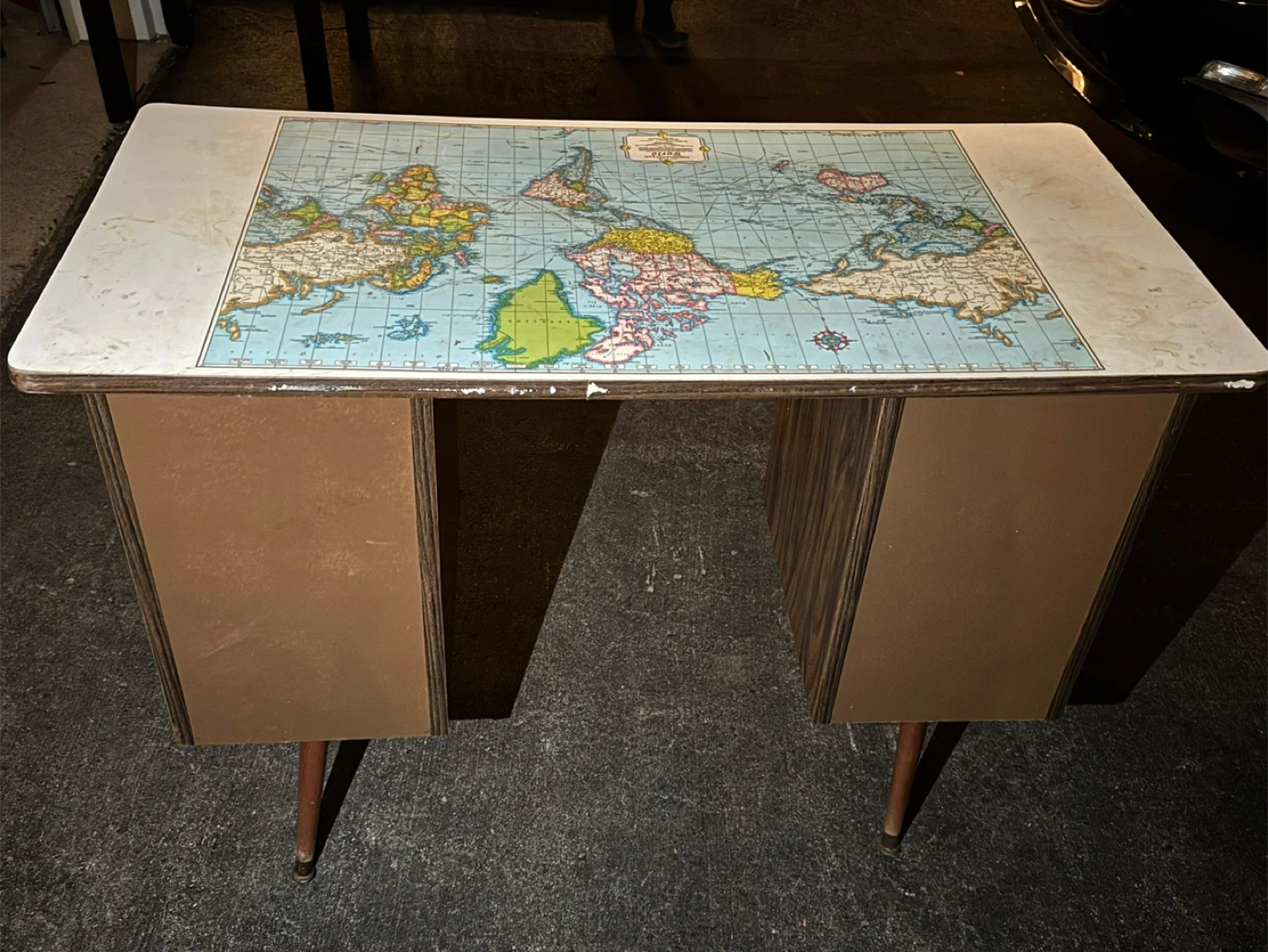 Selling a vintage desk with a world map design on top. It has a unique look with wood-tone cabinets and slender legs. It's a great conversation piece!