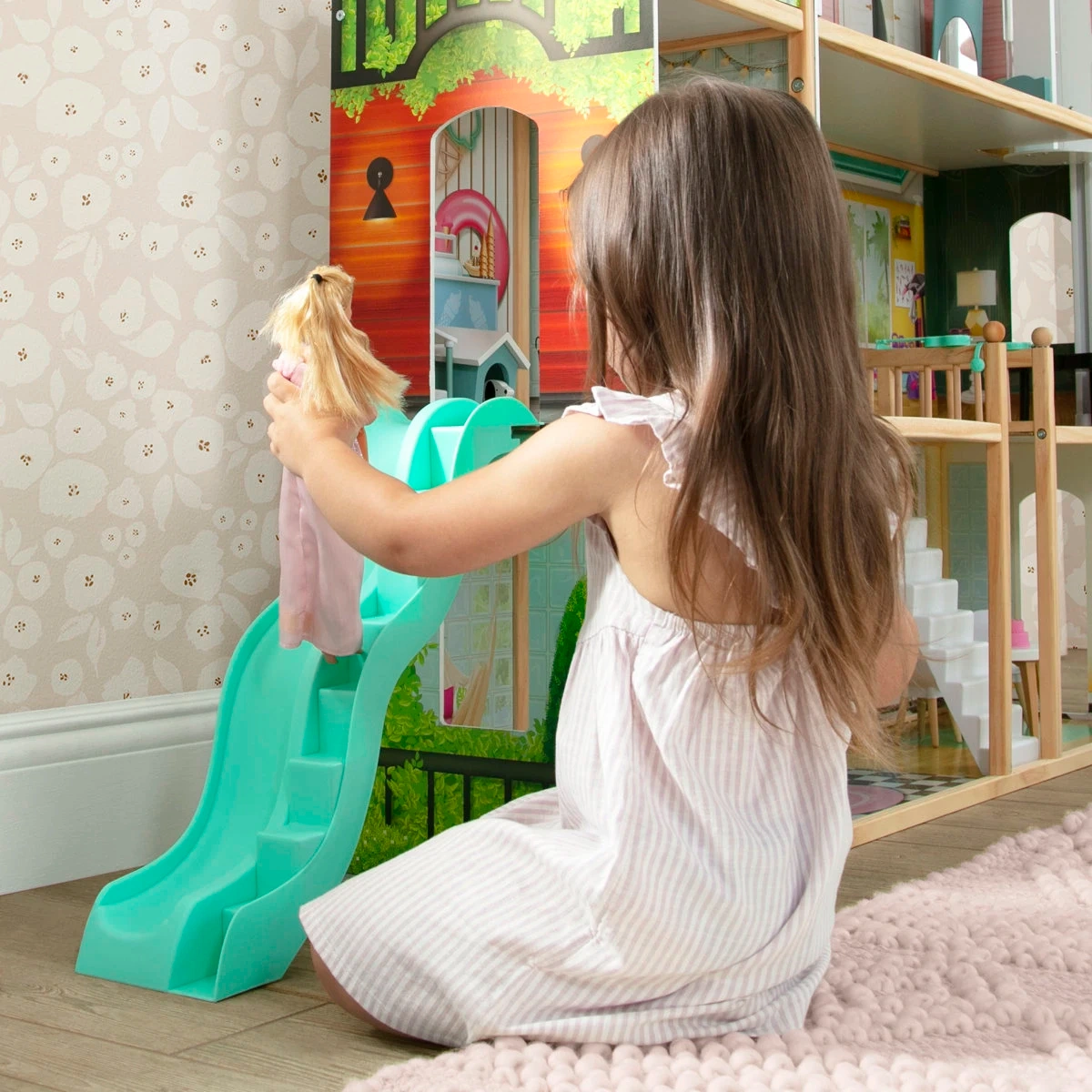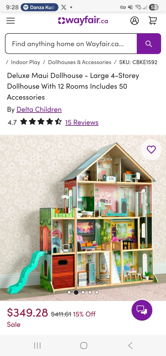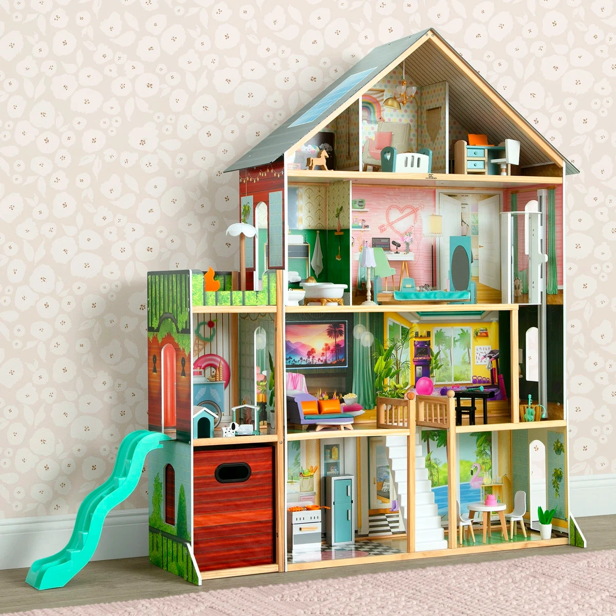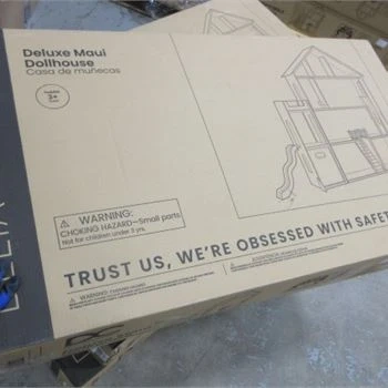 Selling a Delta Children Deluxe Maui Dollhouse! It's a large, 4-storey dollhouse with 12 rooms. It also comes with 50 accessories. It's 5'H (61"H), 1.33'D (16"D), and 5.4'W (65"W)