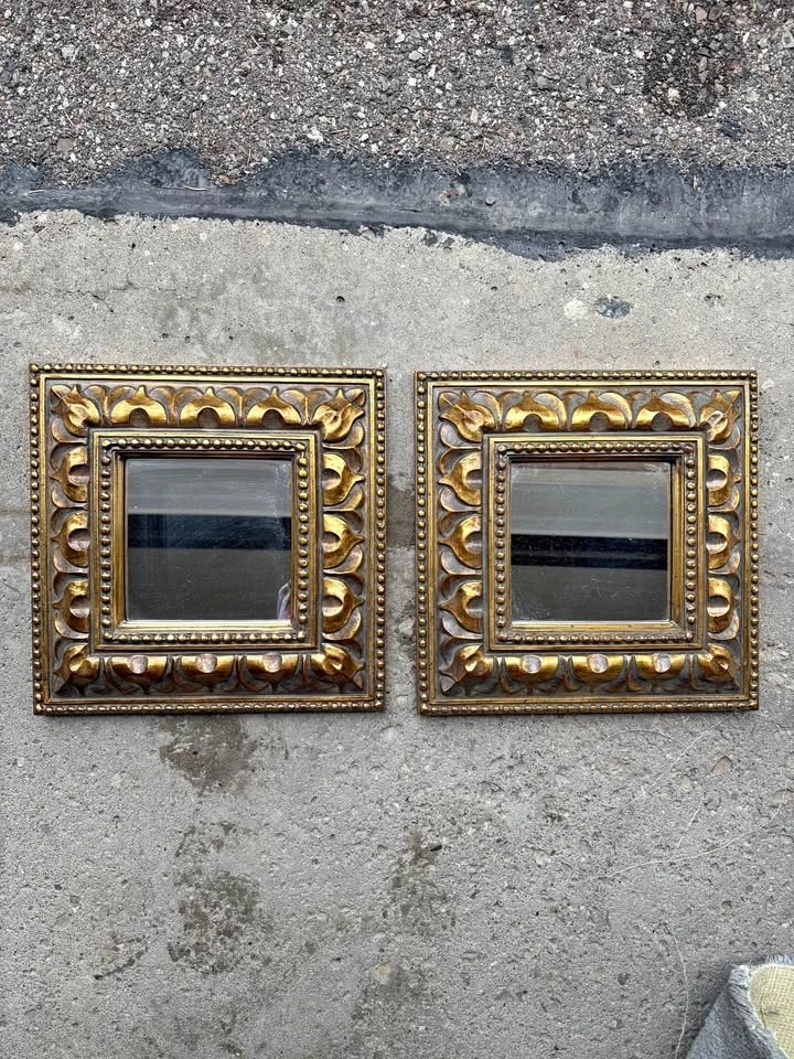 A pair of gold square mirrors in wonderful condition, just hung on the wall.