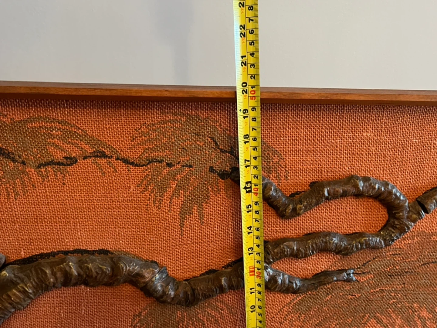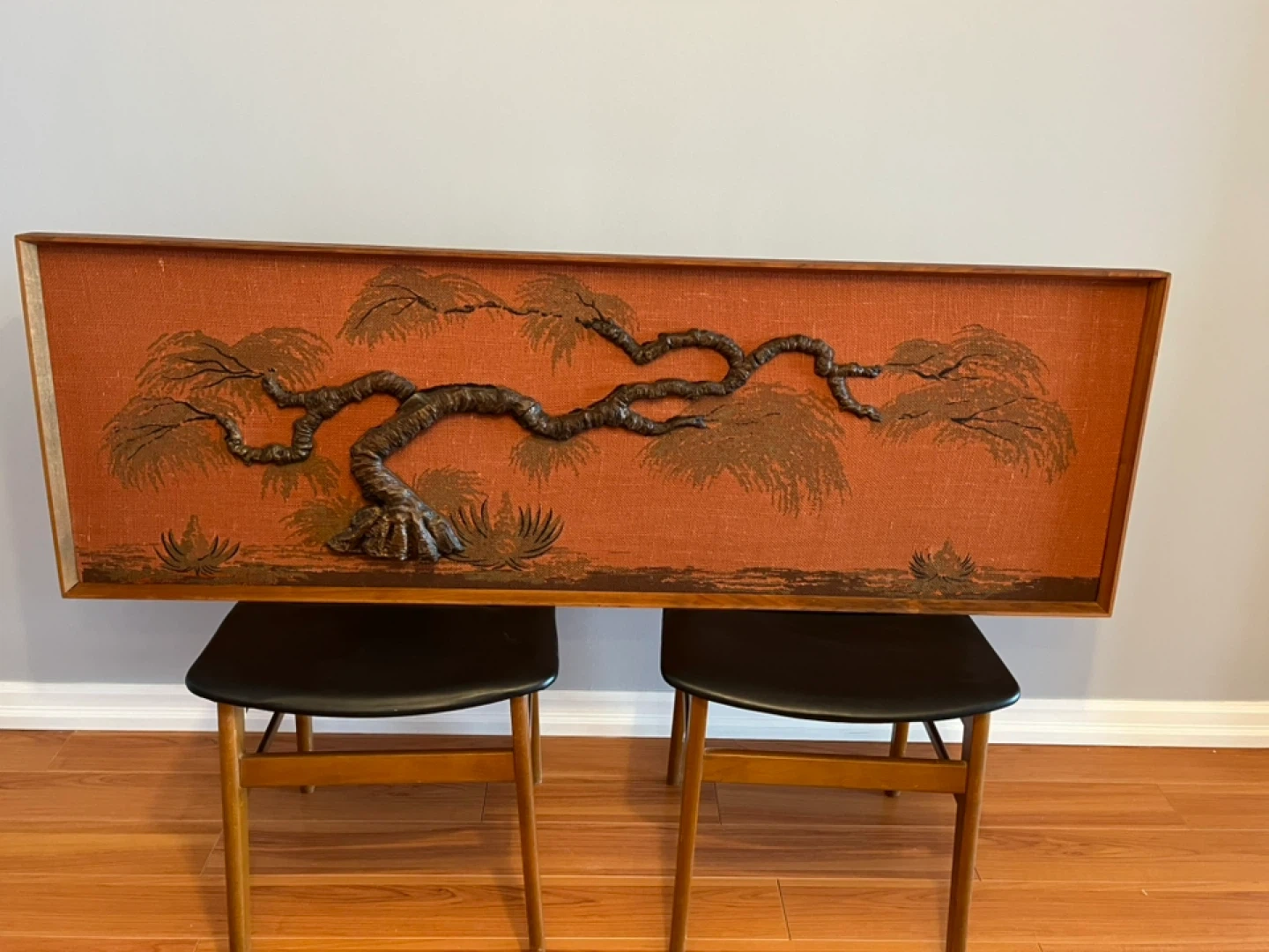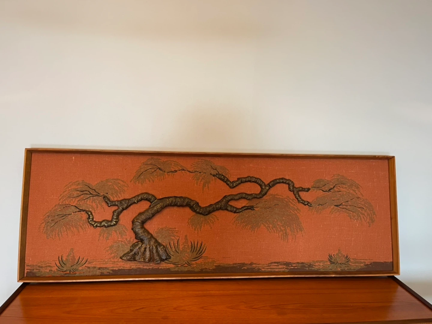 A stunning Mid-Century Modern textured wall art featuring a sculpted wood tree on a woven linen background.