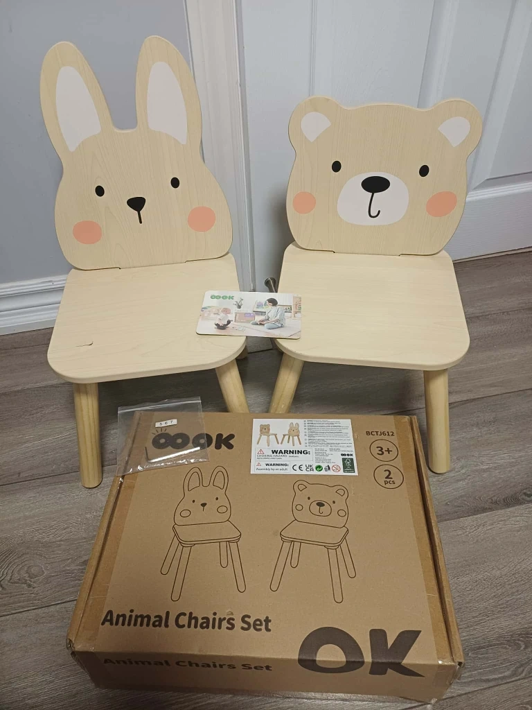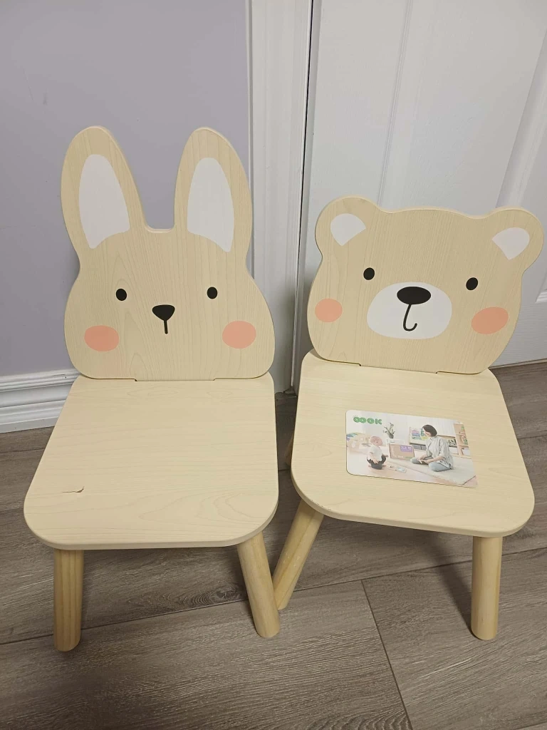 Selling a set of adorable Oook kids chairs, one with a bear design and the other with a rabbit design. They're perfect for a playroom or kids' room! There is a small crack on the seat of the rabbit chair.