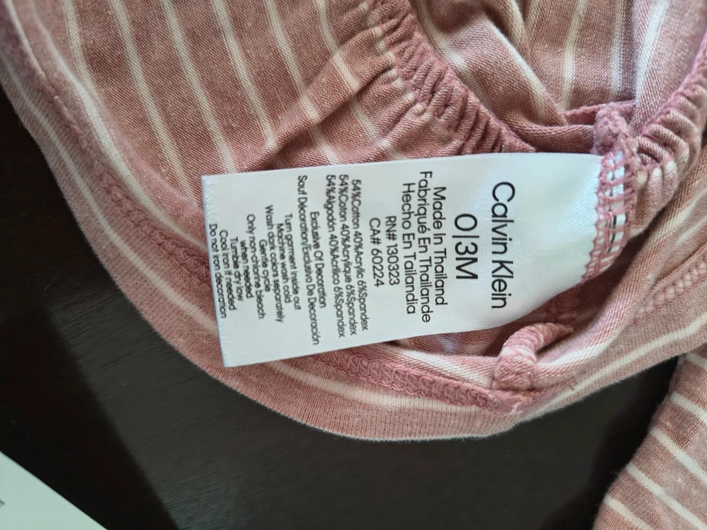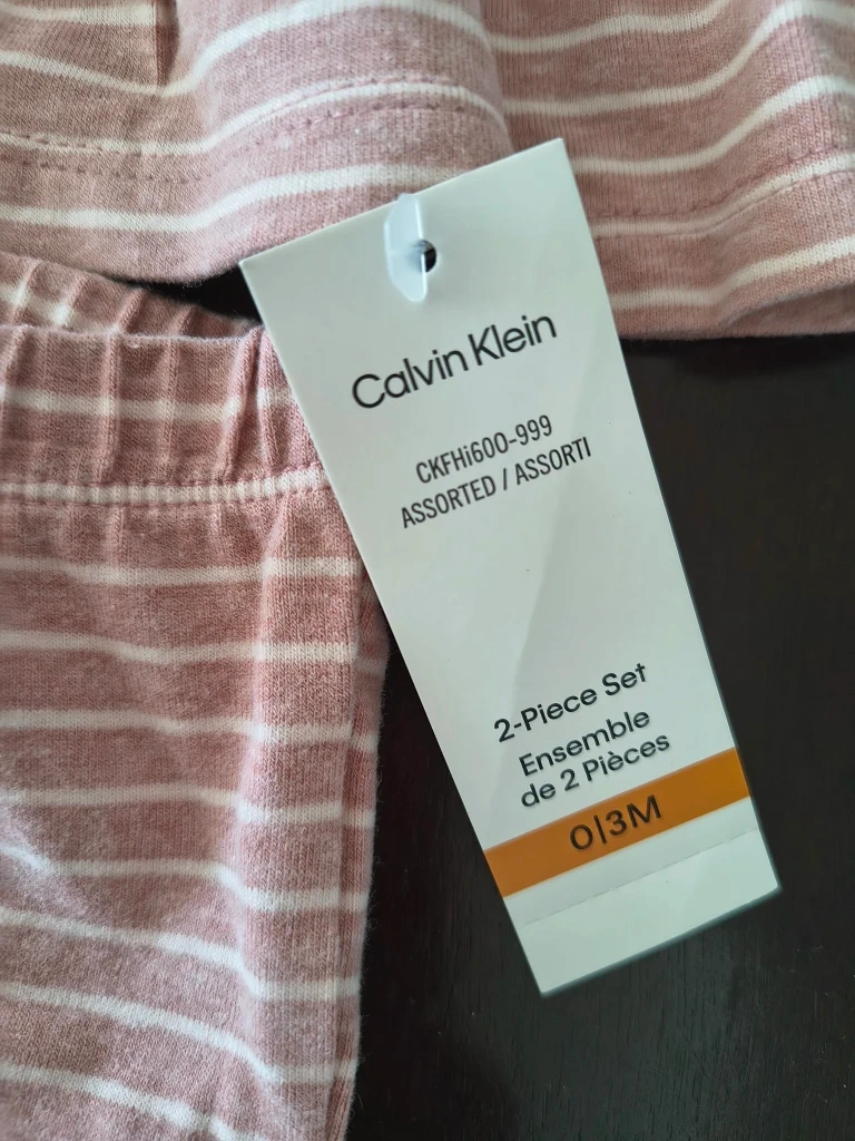 This is a brand new Calvin Klein 2-piece set in size 0-3 months! The set is a cute striped pattern in a soft pink and white colour. It includes a long-sleeved top and matching pants. Perfect for your little one!