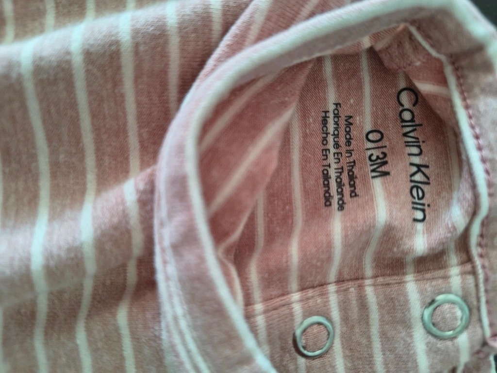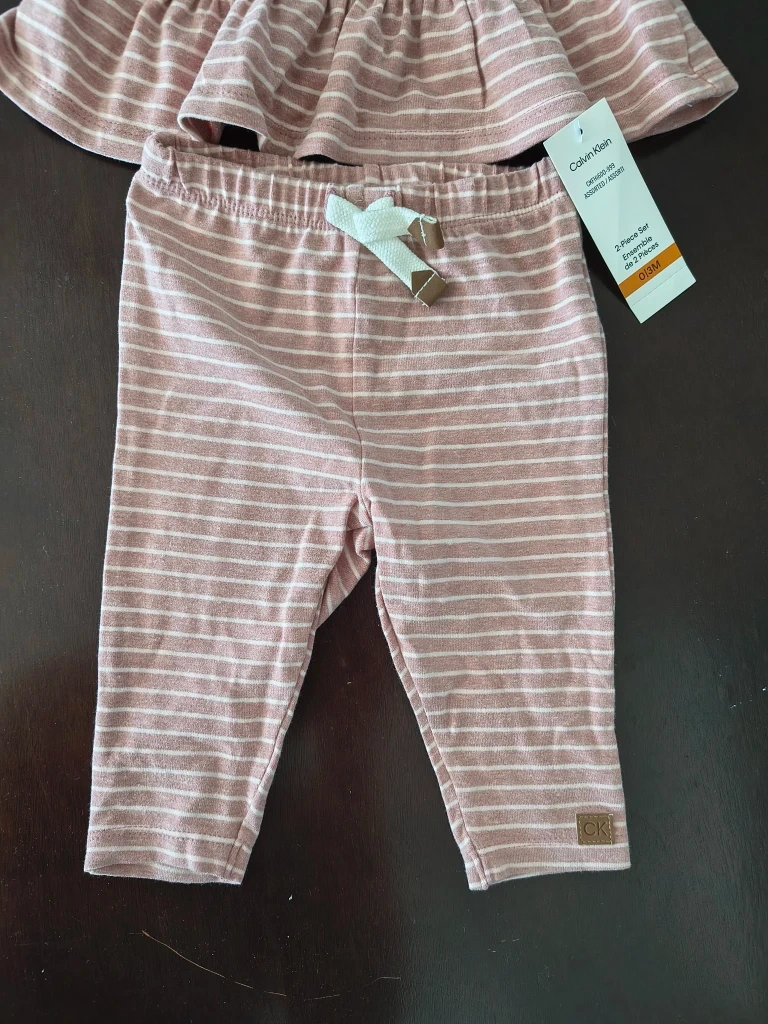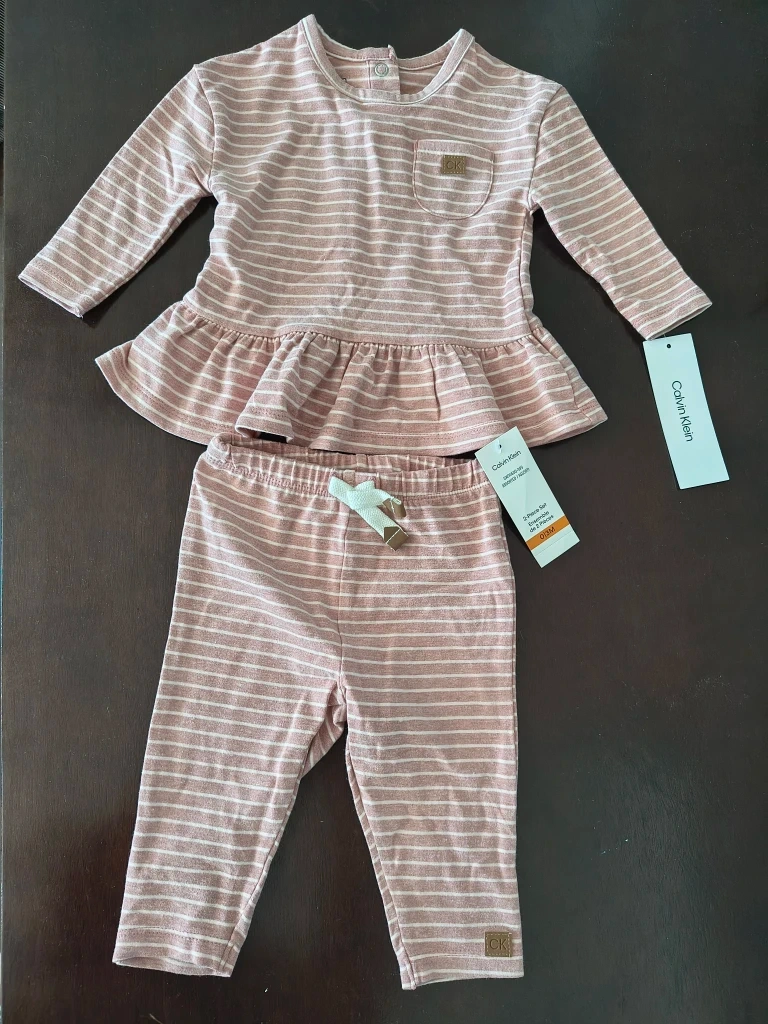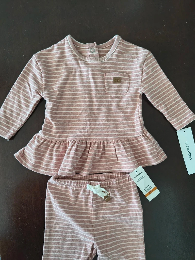 This is a brand new Calvin Klein 2-piece set in size 0-3 months! The set is a cute striped pattern in a soft pink and white colour. It includes a long-sleeved top and matching pants. Perfect for your little one!