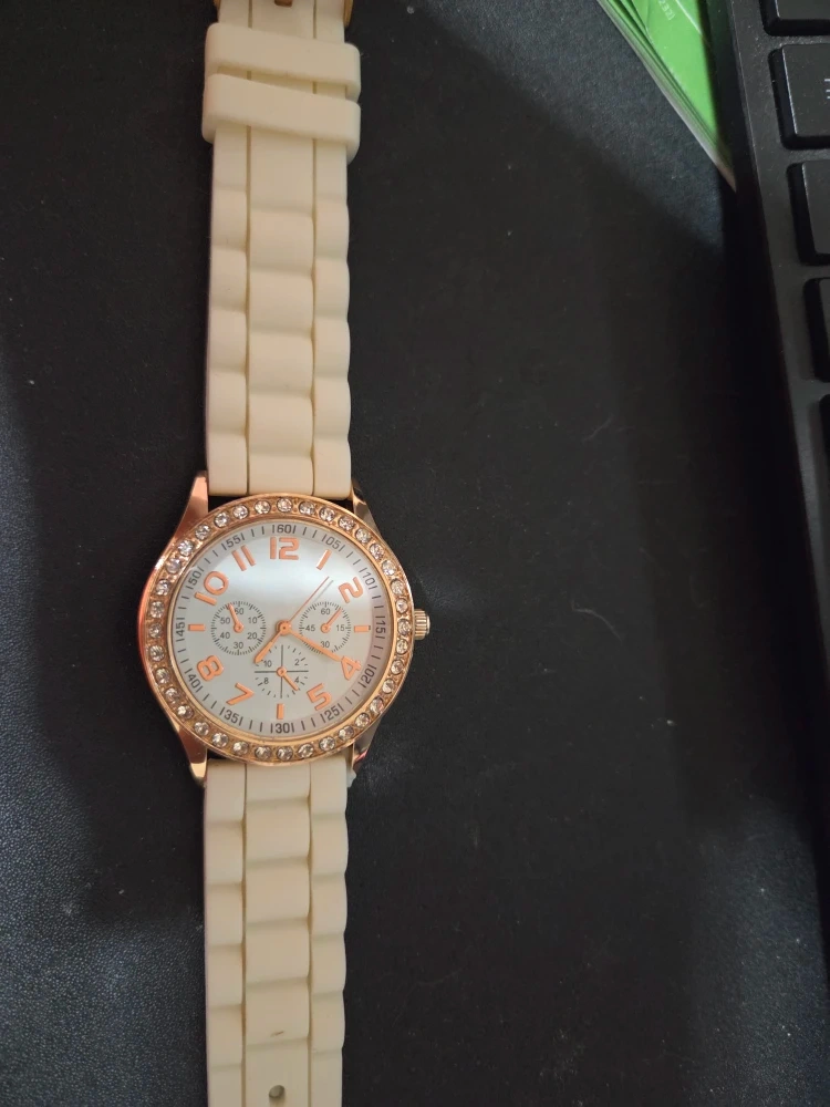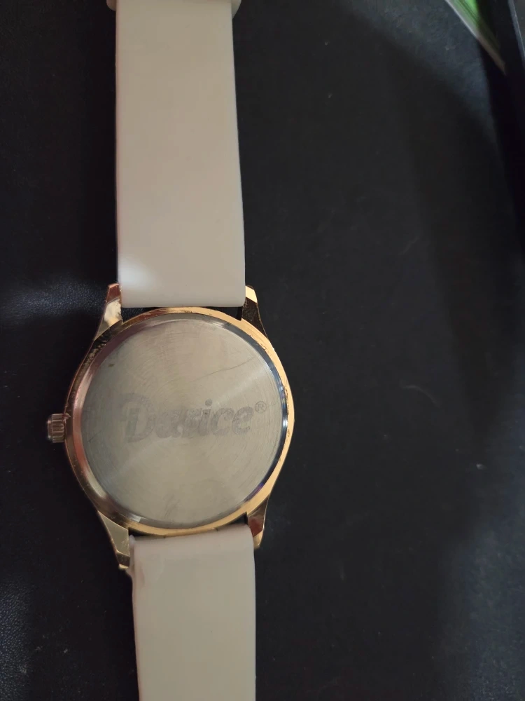 Selling a women's watch by Device! It features a cream-coloured band and gold accents around the face. The watch face has a unique design with a few smaller dials. It is in good condition and ready for a new wrist!