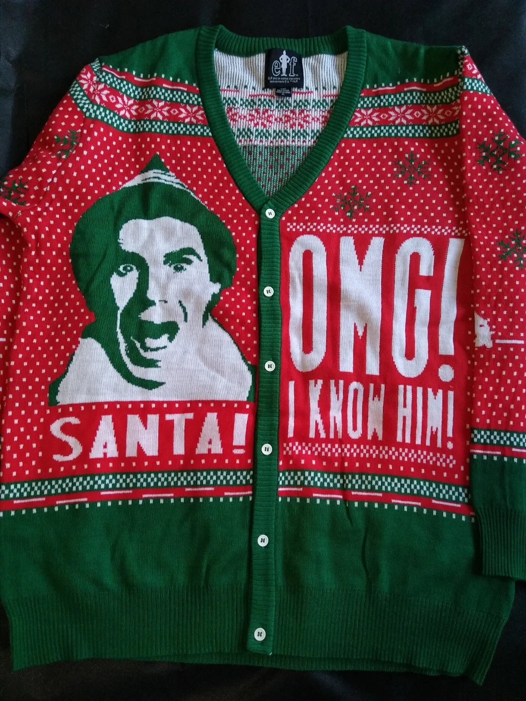 Get ready for the holidays with this fun and festive ugly Christmas sweater cardigan! It's perfect for family get-togethers and parties. The cardigan features a colourful design with Elf movie elements.
