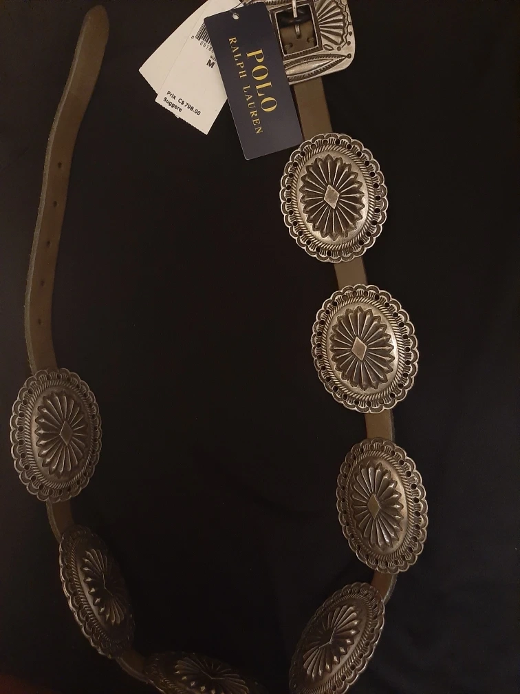 Selling a brand new Ralph Lauren Polo belt! It's a size medium and features a unique concho design. The tag shows it originally retailed for $798 CAD. Never worn and ready for a new owner!