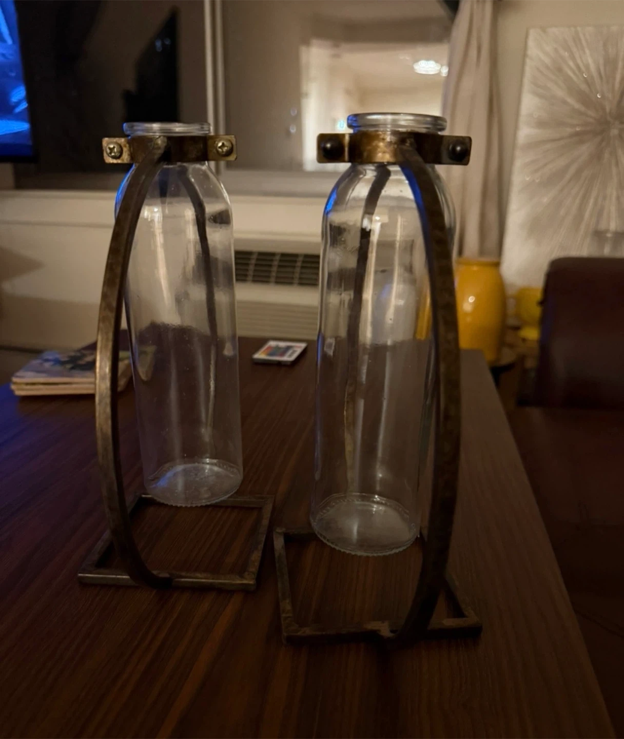 Giving away a set of two glass bottle vases, each with a unique metal stand. These vases are perfect for adding a touch of modern elegance to your home decor. They're in great condition and ready to display your favorite flowers or greenery