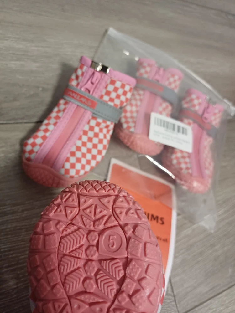 They are waterproof and Non-slip shoes/ dog boots. They are pink and white checkered, and size 5 for small to medium dogs. Never been used!