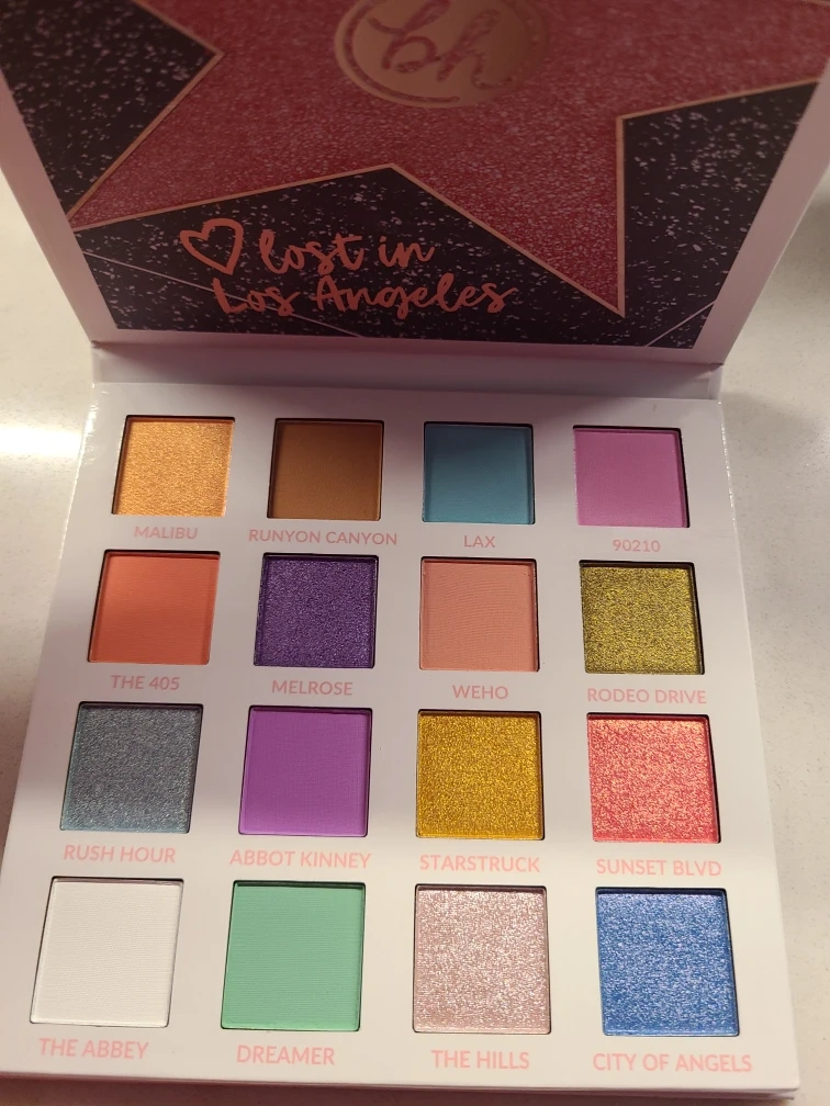 BH Cosmetics Lost in Los Angeles 16-color eyeshadow palette. It's in great condition and features a variety of vibrant and shimmery shades inspired by the city of angels. Each vegan hue is inspired by selfie-centric streets and graffiti walls around the sprawling city of smooth mattes.