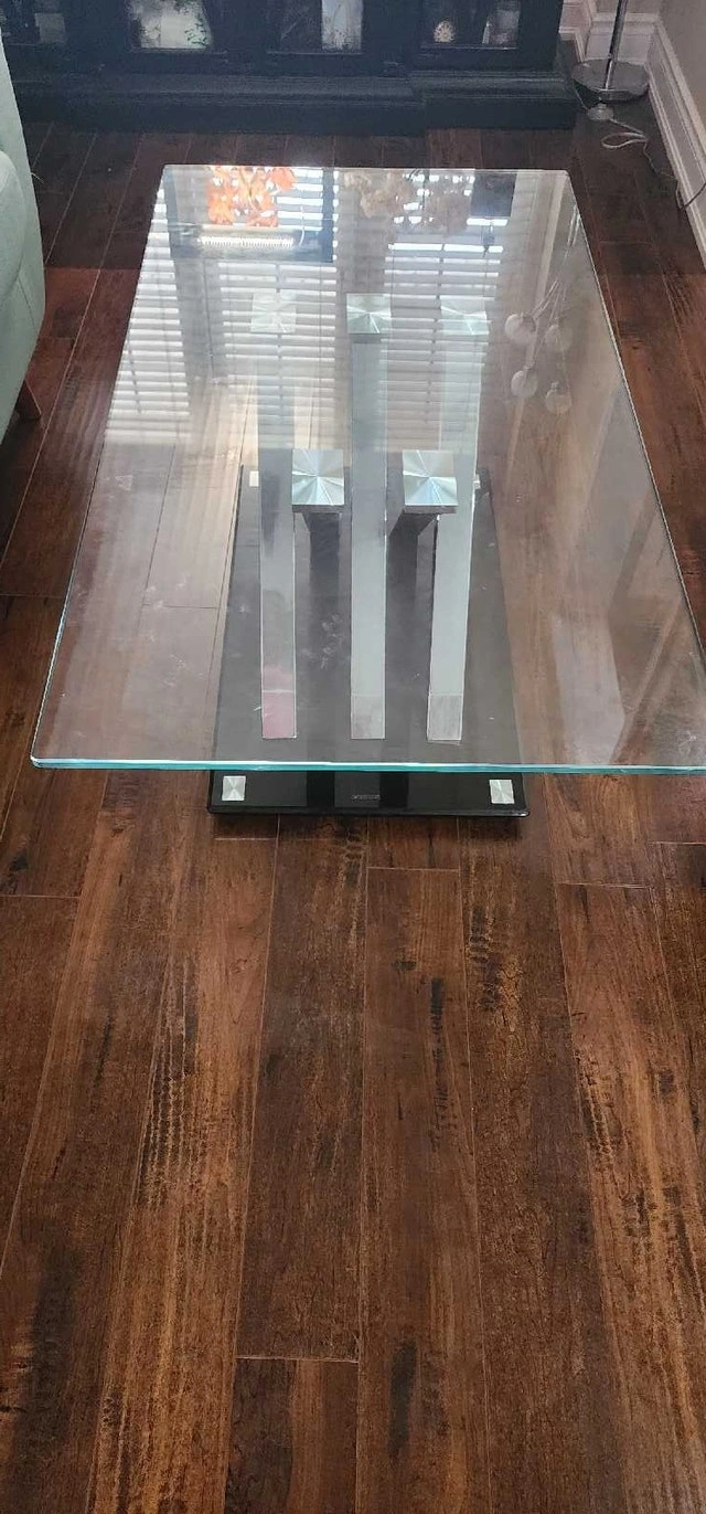 Modern glass coffee table to add a touch of modern elegance to your living room. Features include: Thick tempered glass top (durable and easy to clean), four solid chrome/metal pillars (strong, stylish support), and a glossy black base (adds a luxurious contrast). Perfect size for any modern living space (approx. 4ft x 2.5ft x 1.5ft). This table is in excellent condition — no cracks or chips. Ideal for condos, homes, or offices where you want a clean, minimalist aesthetic. Located in Brampton, Ontario. Pickup only with easy ground-level access.