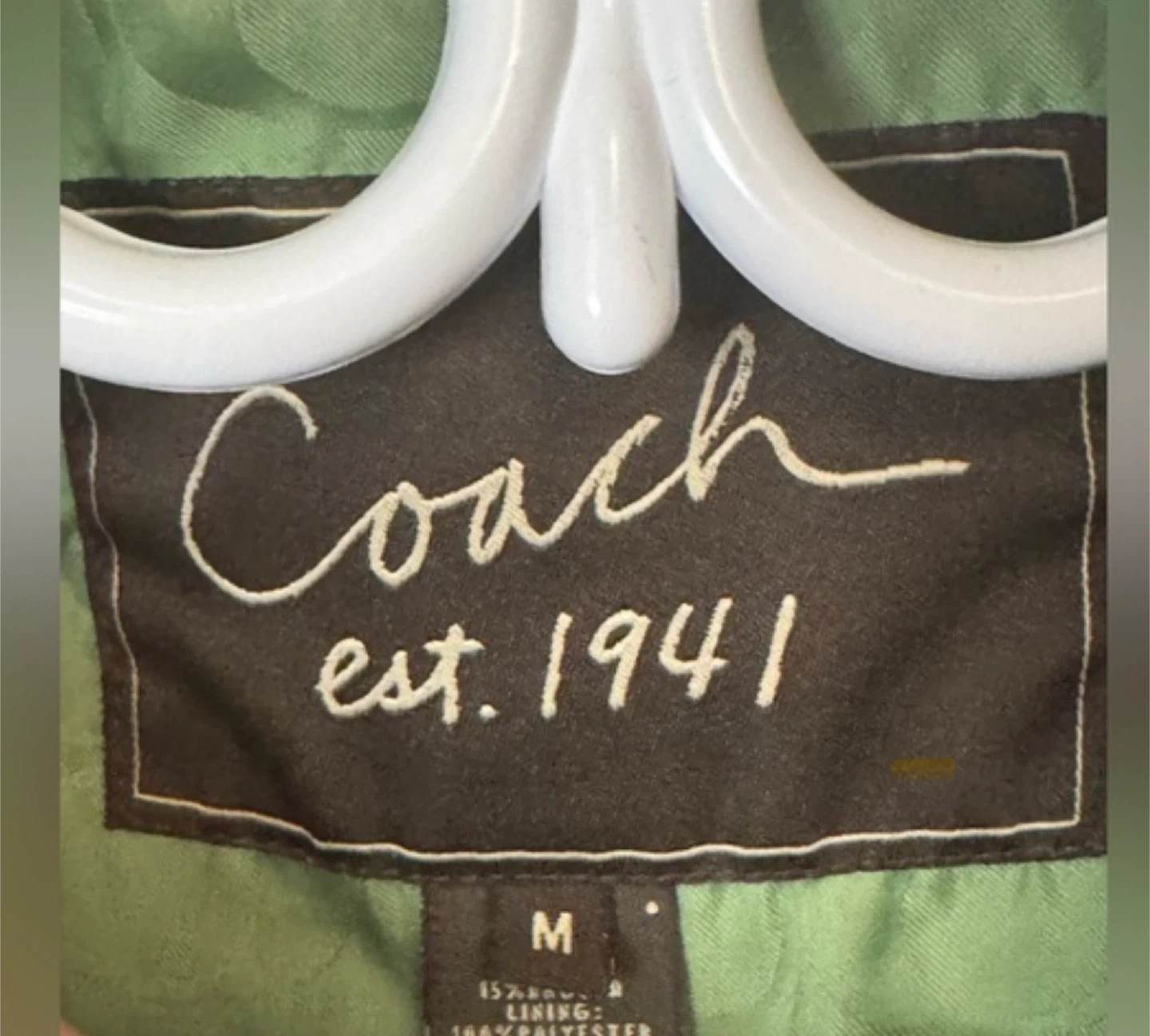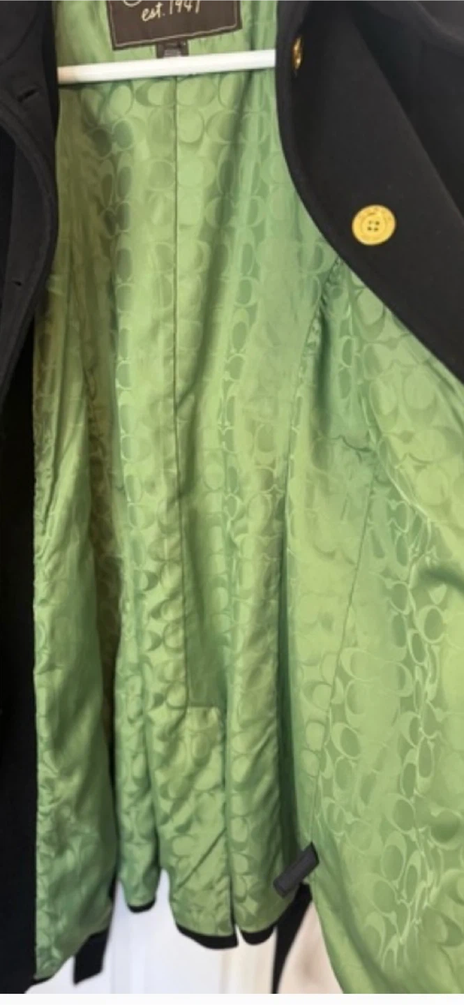 Elegant Coach wool and angora blend coat. Fully lined with green Coach monogram. Belted and side pockets.
