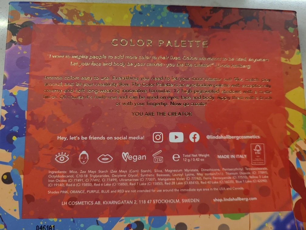 Linda Hallberg Color Palette. It's an eyeshadow palette with exceptionally creamy and soft long-wearing innovative formulas. It has 12 high-pigmented shadows with a matte finish. The palette is multi-use and can be used on eyes, face, and body. Total net weight 12 g/0.42 oz. Made in Italy.