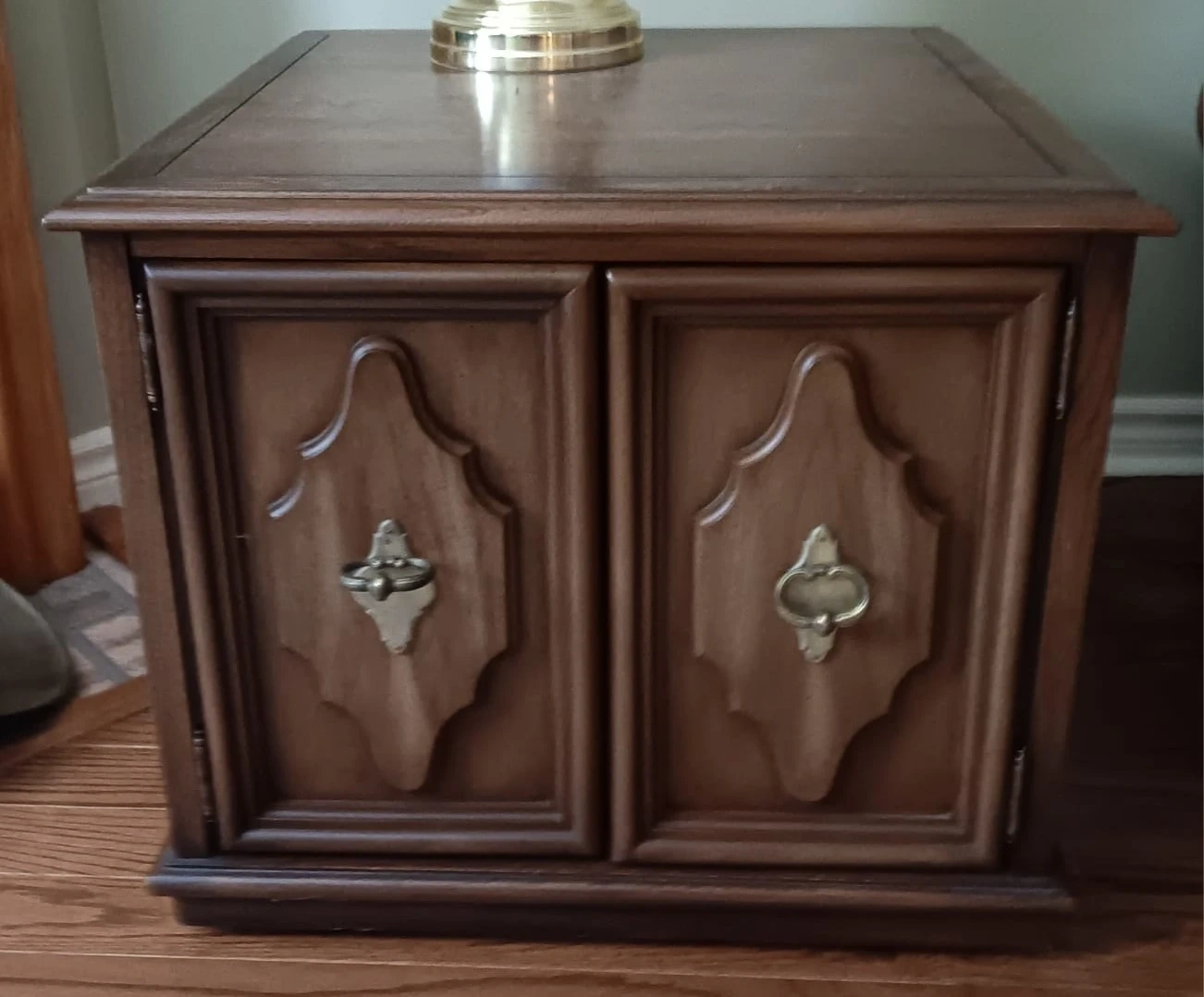 This is an estate sale and there are large coffee and end tables and crystal and silver items as well as dishes, clothing, household items.