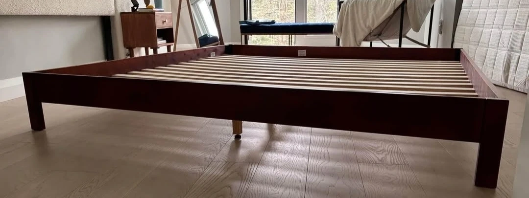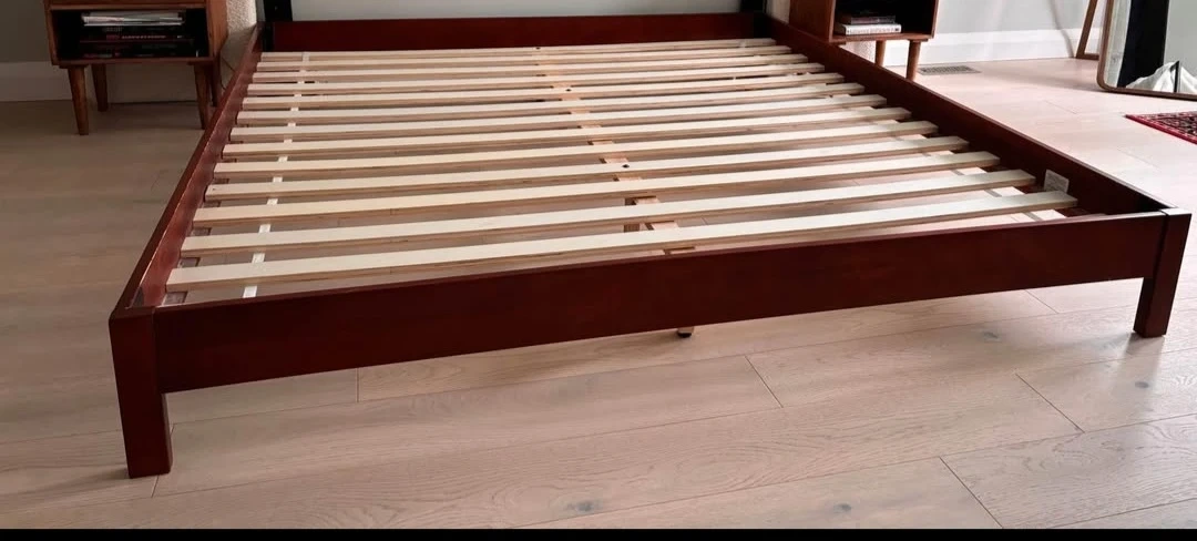 Selling a King size bed frame in a nice brown colour. The frame is in good condition and ready for a new mattress. It measures approximately 83 inches long and 78 inches wide.
