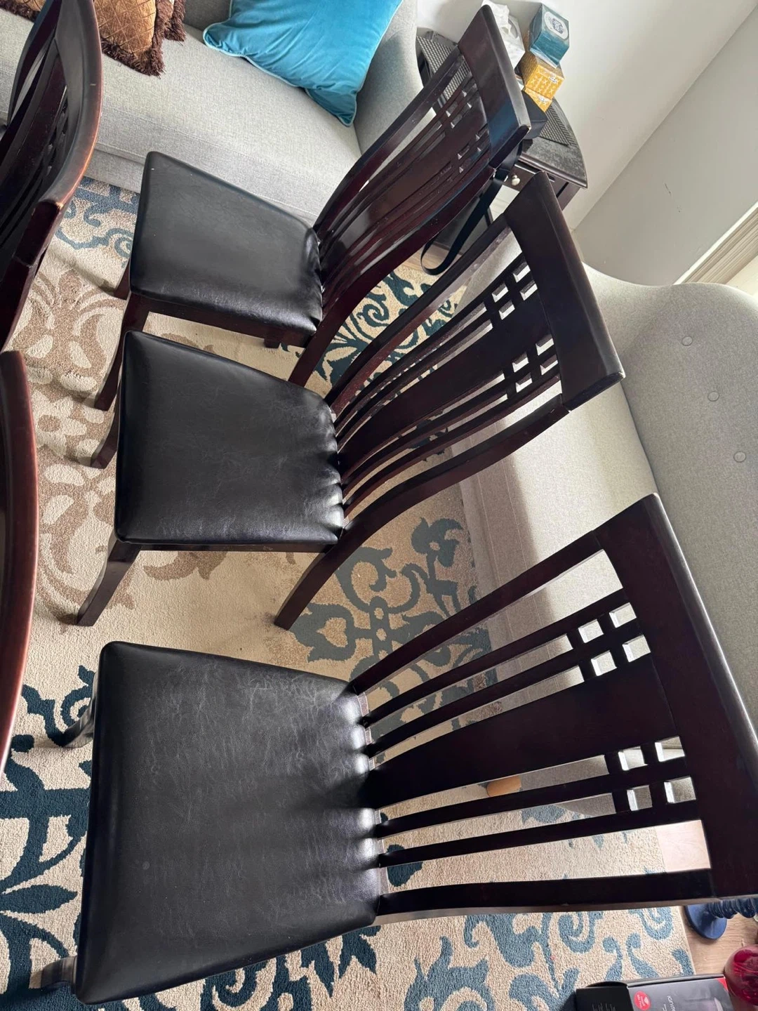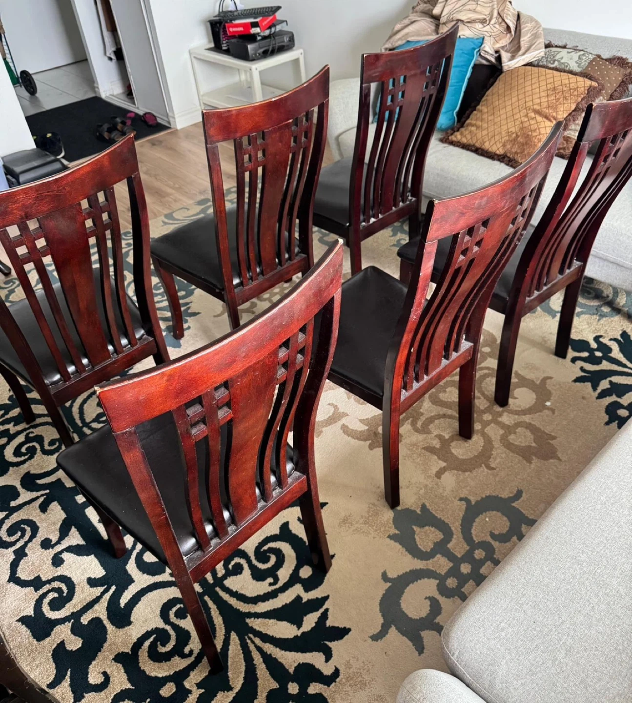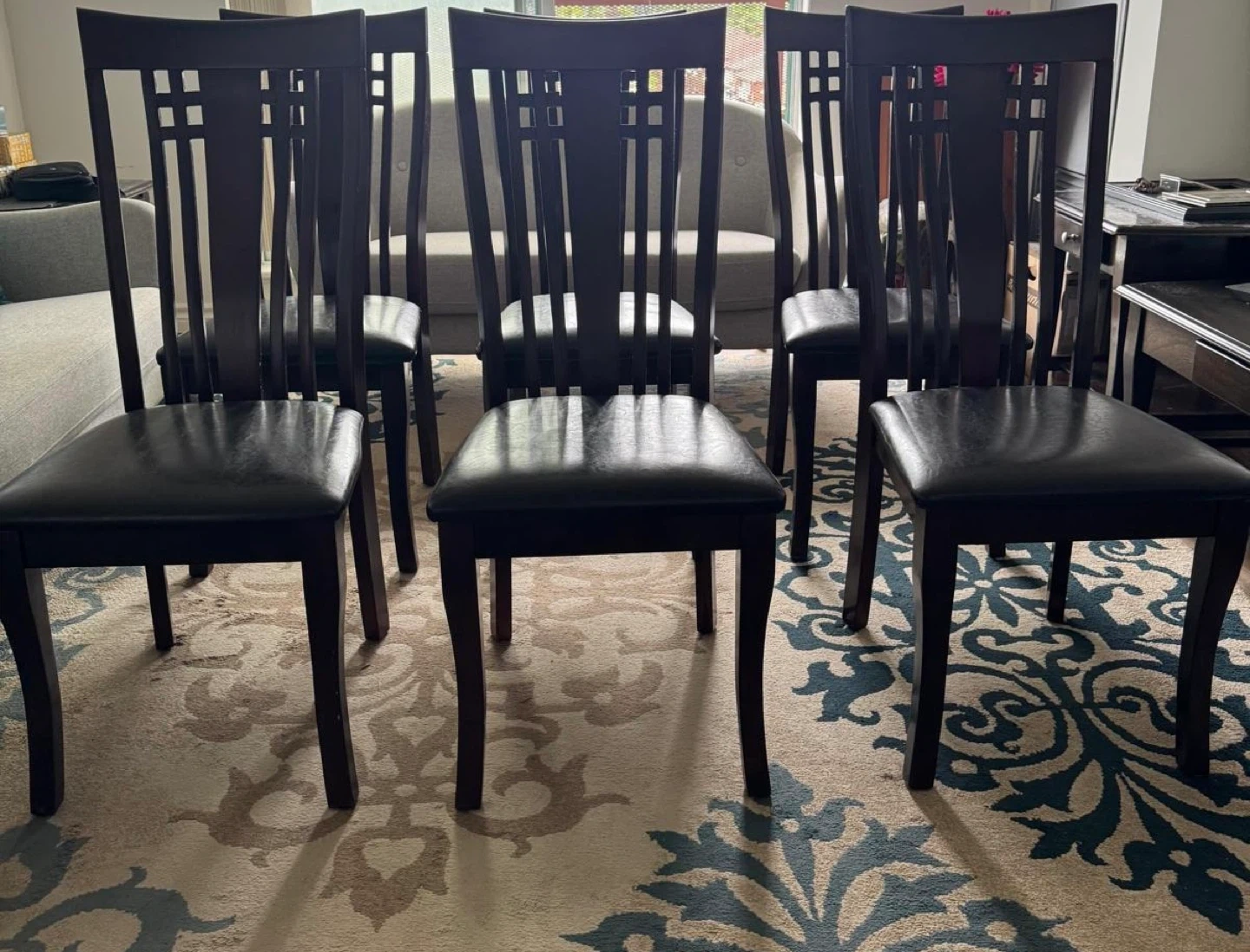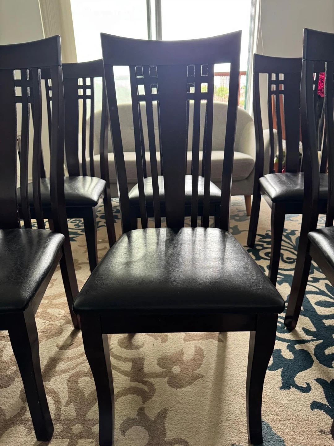 Selling a set of six dining chairs! They feature a lovely wood frame and black seats. They're in great condition and would look fantastic in any dining room.
