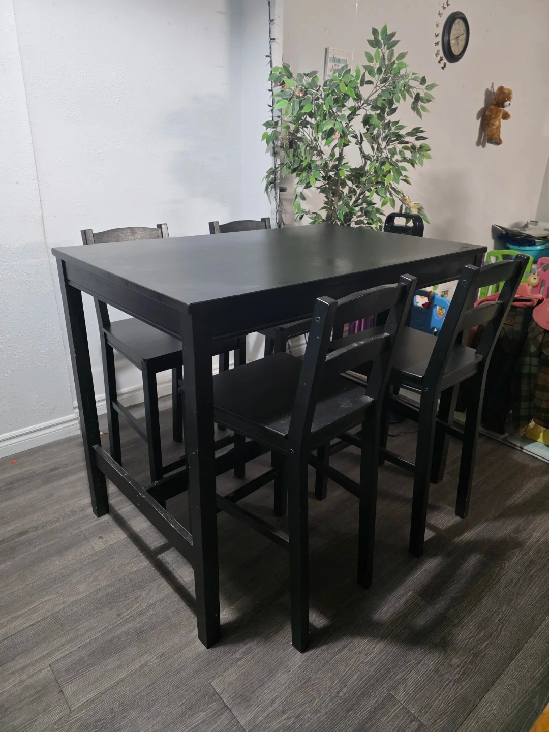 Selling a dining table with four chairs. The set is in black and would be great for a smaller dining space or kitchen nook. It's in good condition and ready for a new home!
