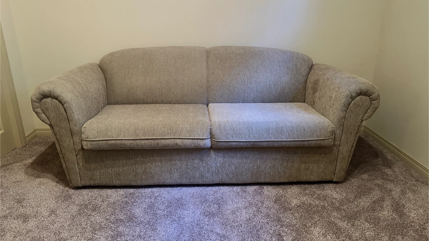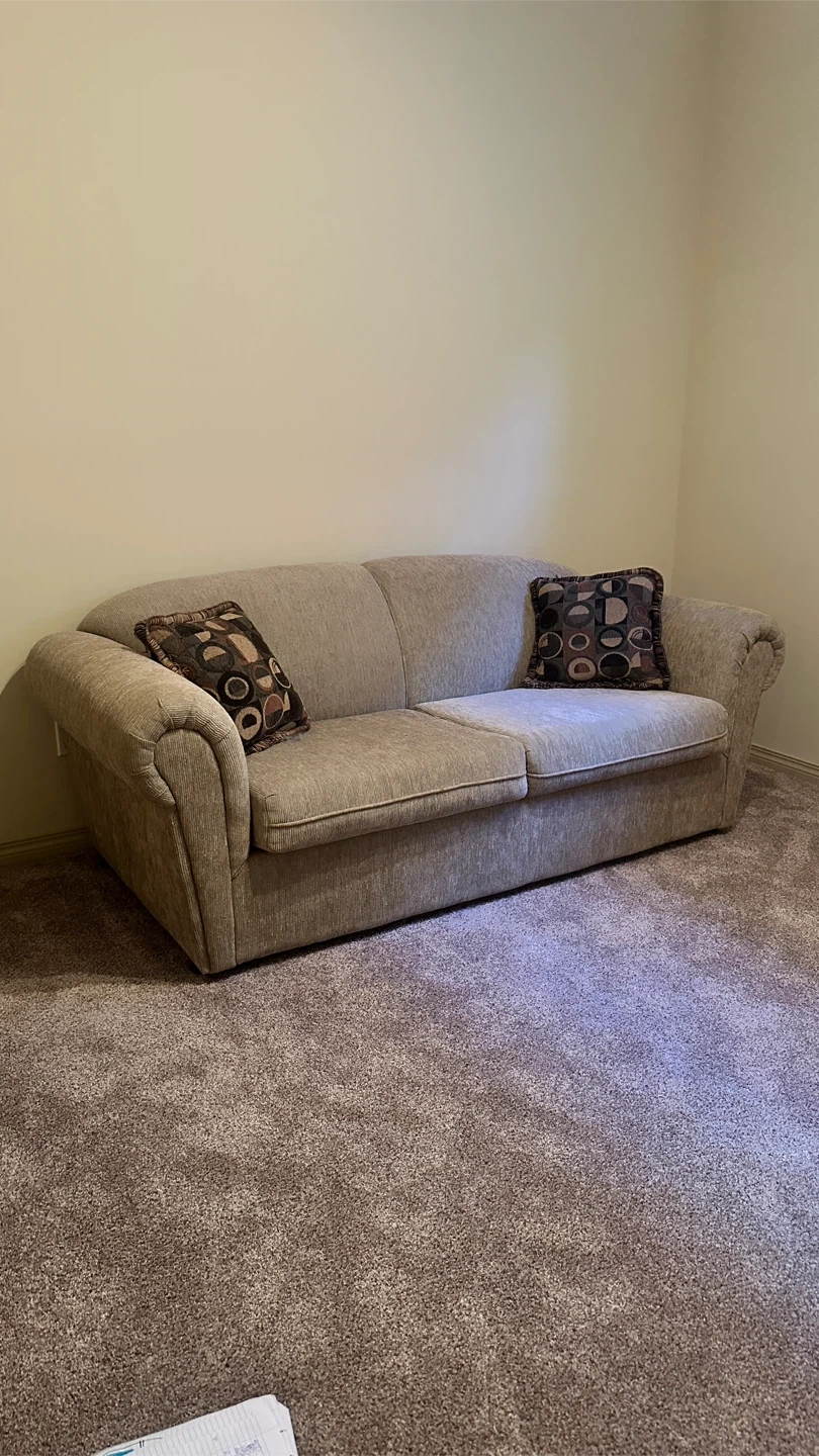 Selling a comfy beige sofa! It's in great condition and ready for a new home. The sofa has a classic design with rolled arms and comes with two decorative pillows. It's perfect for a living room or den! It’s pretty much brand new, it was used once.