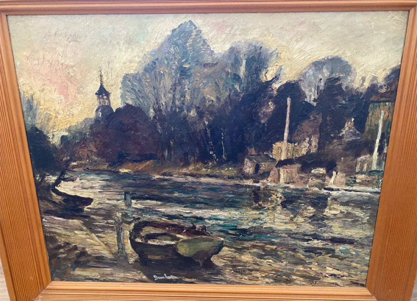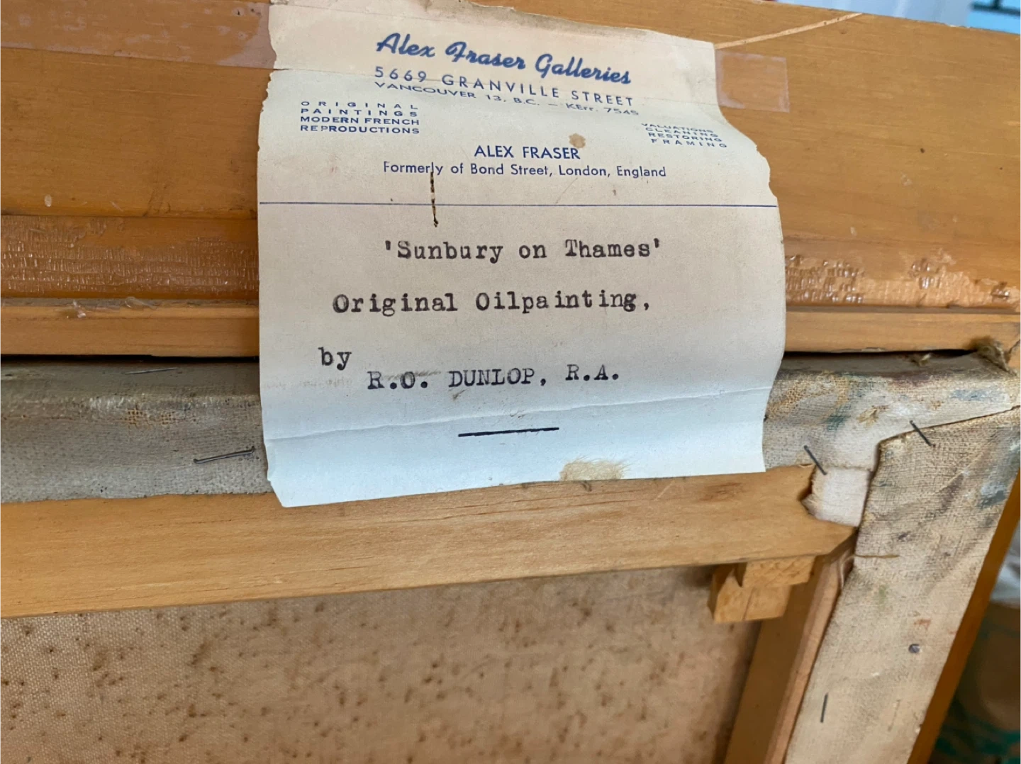 Selling an original oil painting by R.O. Dunlop, R.A., titled 'Sunbury on Thames'. It was formerly with Alex Fraser Galleries in Vancouver.