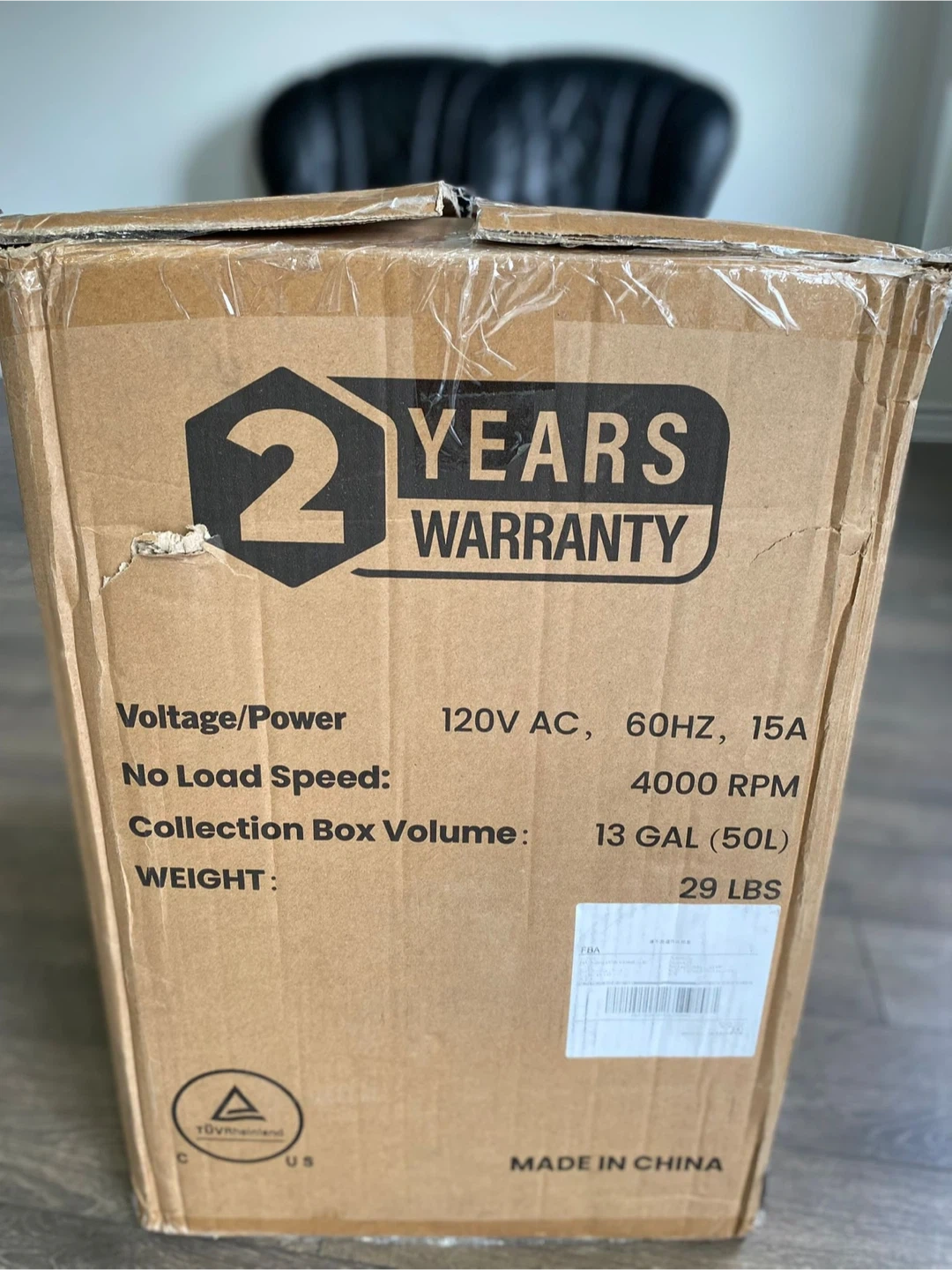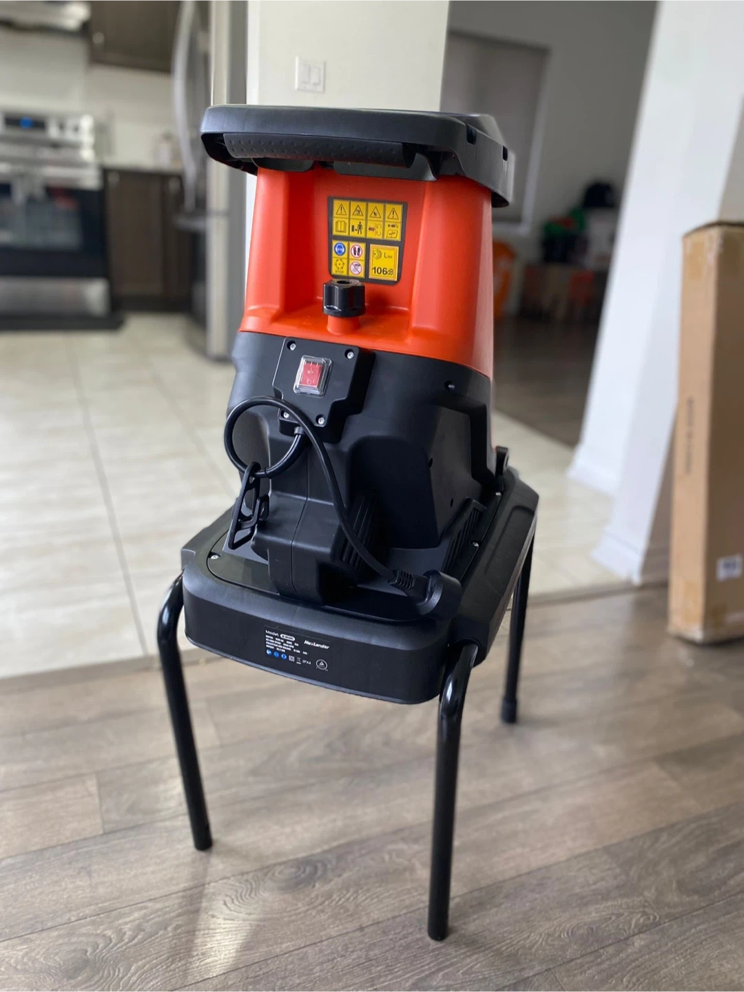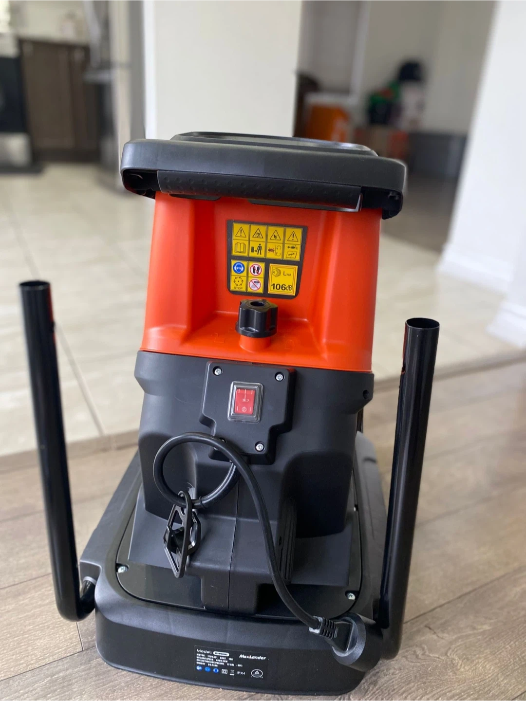 Selling a MaxLander 15-Amp Electric Wood Chipper, model ML-WR3002. The box includes the installation manual and some wheels. The box indicates a 2-year warranty.