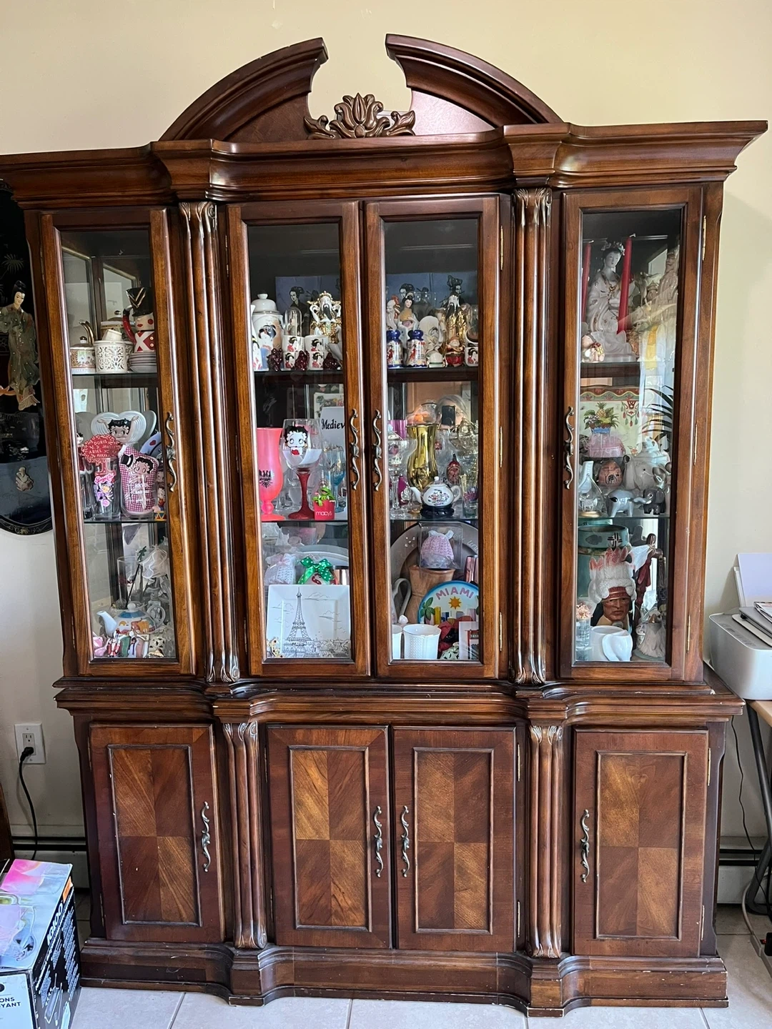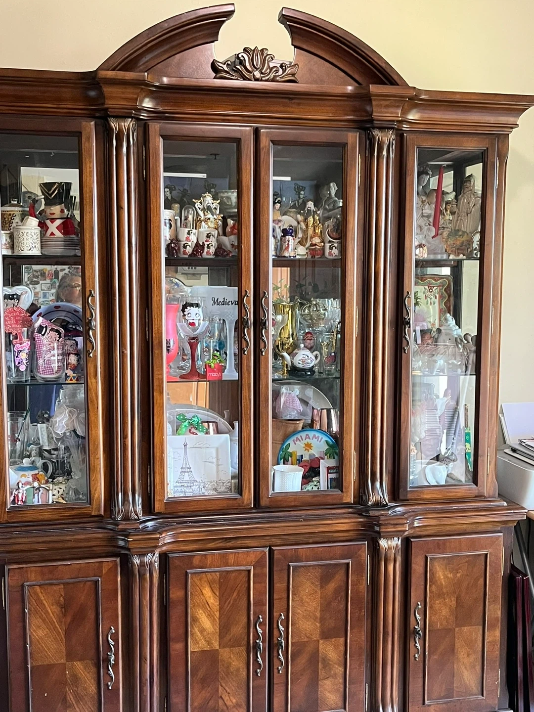 Selling a wooden china cabinet, table and six dining chairs. The set is in good condition and would be a great addition to your dining room or kitchen. The chairs have a unique design on the backrest.