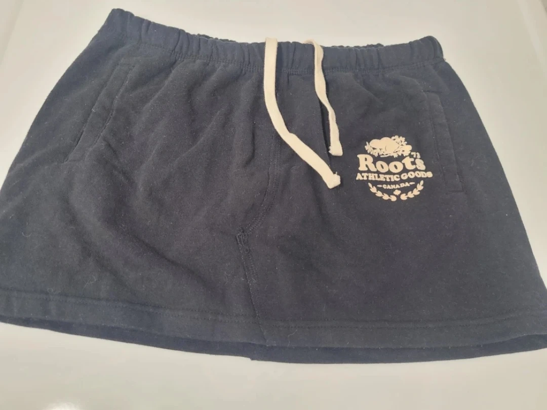 Sellinga Roots Athletic skirt in black. It's a size small and in great condition. The skirt features a drawstring adjustable waist, pockets and the classic Roots logo. Perfect for casual wear!