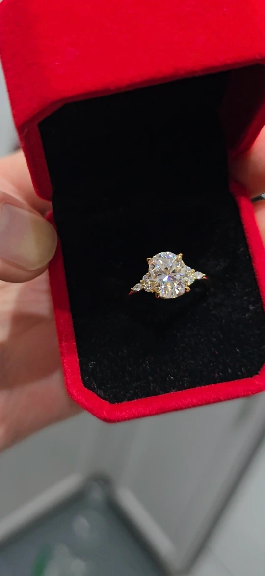It features a stunning oval cut centre stone, complemented by smaller accent diamonds on either side, offering a unique and sophisticated design.