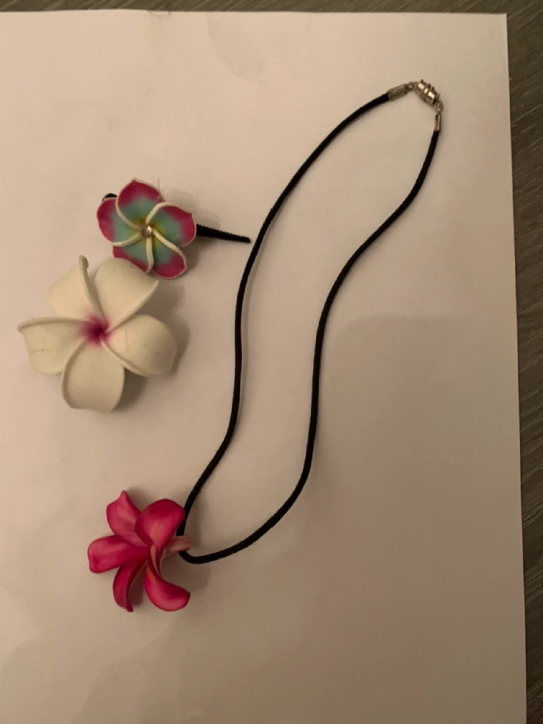 Selling a beautiful Hawaii Plumeria flower necklace with a black cord and two matching flower hair clip. The necklace features a pink flower pendant, and there's also a white flower and a pink and blue flower hair clip included. Perfect for adding a touch of summer to any outfit!