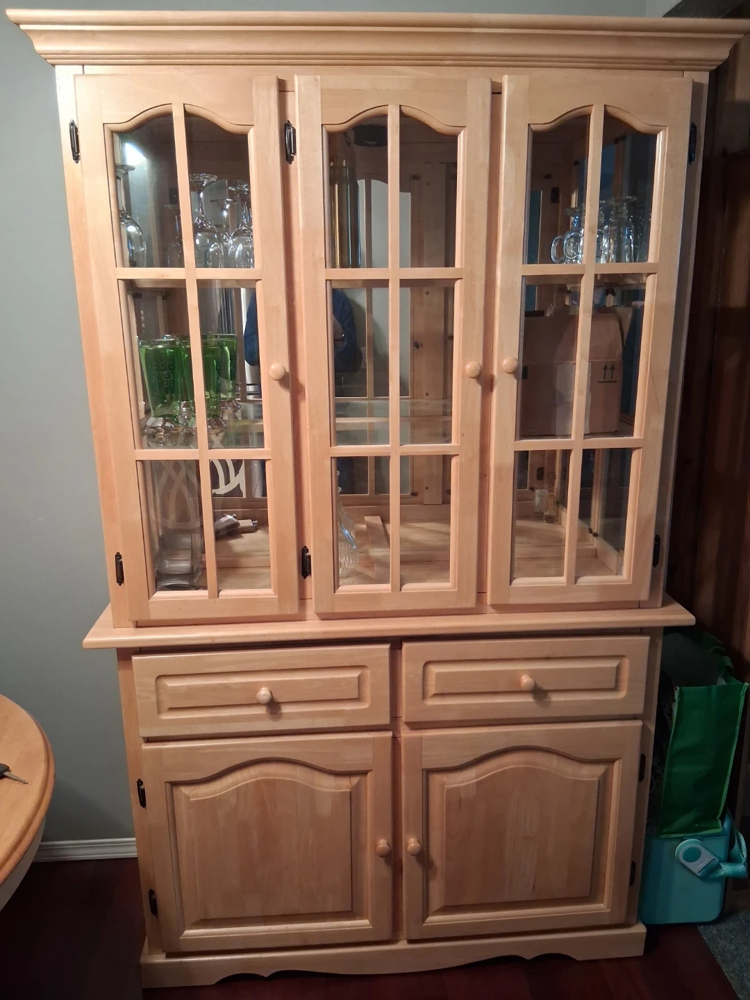 Selling a wooden china cabinet. It features glass doors on the top portion, with two glass shelves, mirrored backing and a light in the top. It has solid doors on the bottom, two shelves and has drawers in between. A great piece for displaying your favourite items or storing dining essentials!