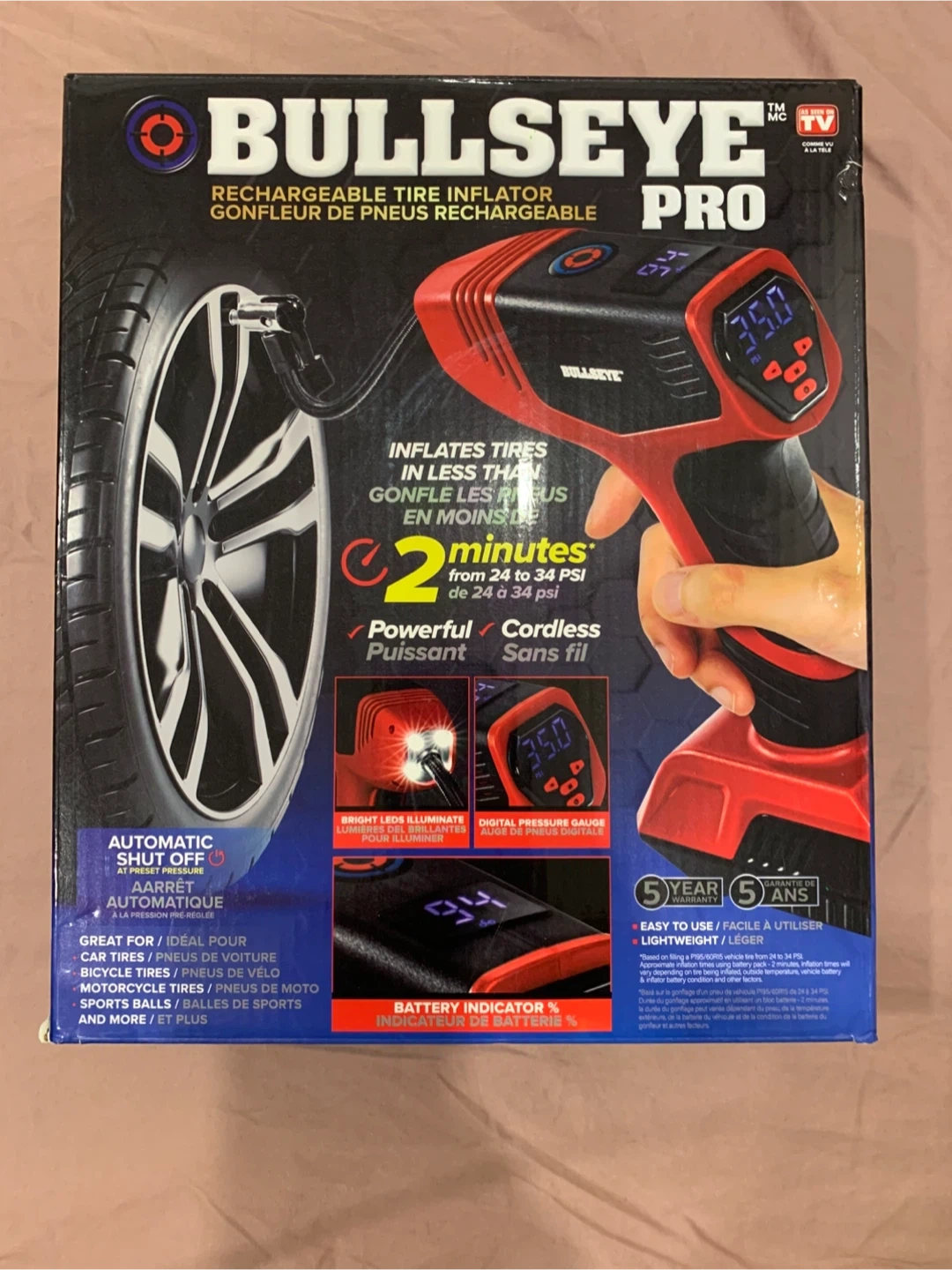 Selling a brand new Bullseye Pro rechargeable tire inflator, still in its original box! It's perfect for inflating car tires, bicycle tires, and sports balls.