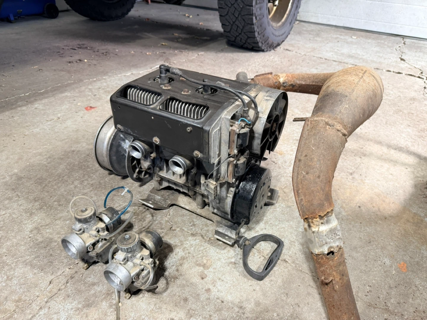 The original motor was bad and has been removed. Included is a 500cc Rotax air-cooled engine with excellent compression in both cylinders. Comes complete with carbs throttle cable installed and clutch.