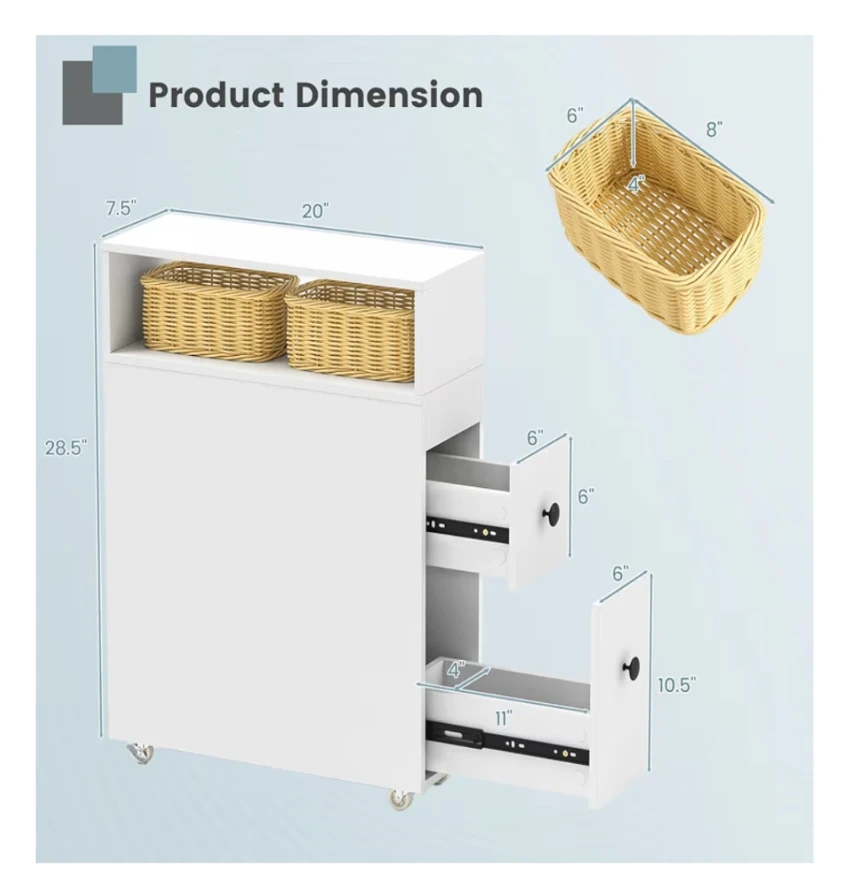 This slim rolling storage cart is perfect for adding some extra storage to any room! It features two drawers and an open top shelf with space for baskets. The dimensions are 20" wide, 7.5" deep, and 28.5" high. The baskets are 8" wide, 6" deep, and 4" high.