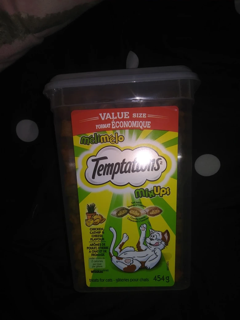 Selling a brand new container of Temptations MixUps cat treats! It's the 454g size, with a yummy chicken, catnip, and cheese flavour. These treats have a soft inside and a crunchy outside, sure to be a hit with your kitty!