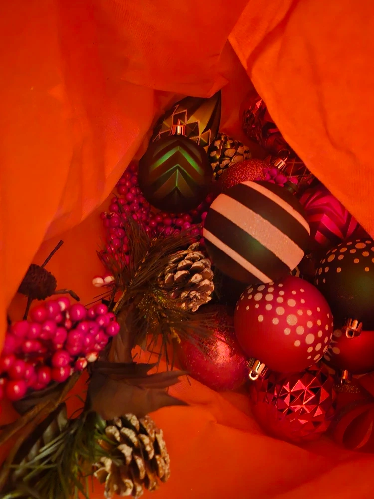 A festive collection of Christmas ornaments in various colours and designs, along with natural pine cones. Perfect for adding a touch of holiday cheer to your home!