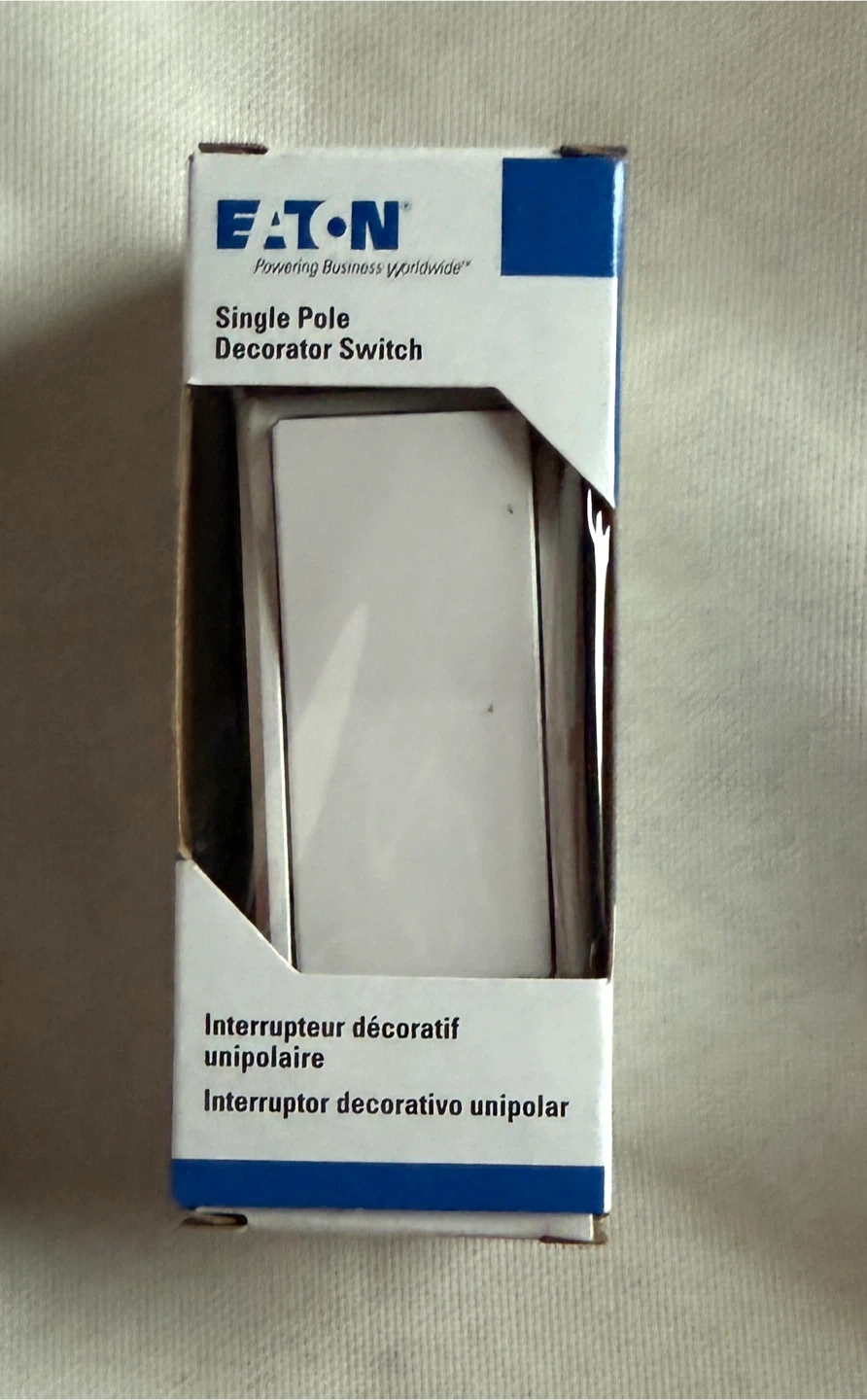 Giving away a brand new Eaton single pole decorator switch, still in its original packaging! It's white and ready to install. Be sure to follow the instructions inside the box for safe and proper installation
