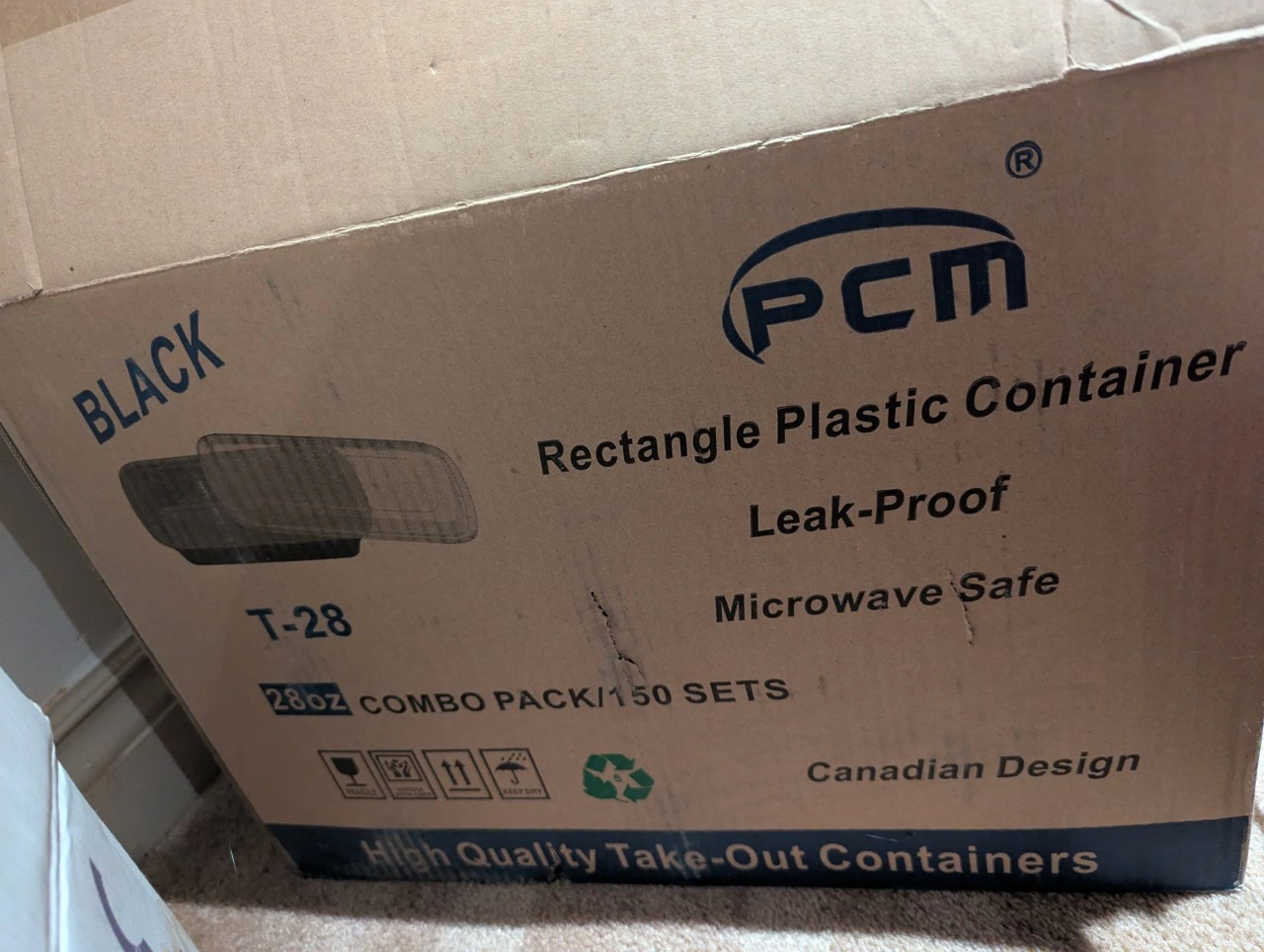 I'm selling a combo pack of PCM rectangle plastic containers. They are leak-proof and microwave safe. There are 150 sets in total. These are high-quality take-out containers designed in Canada