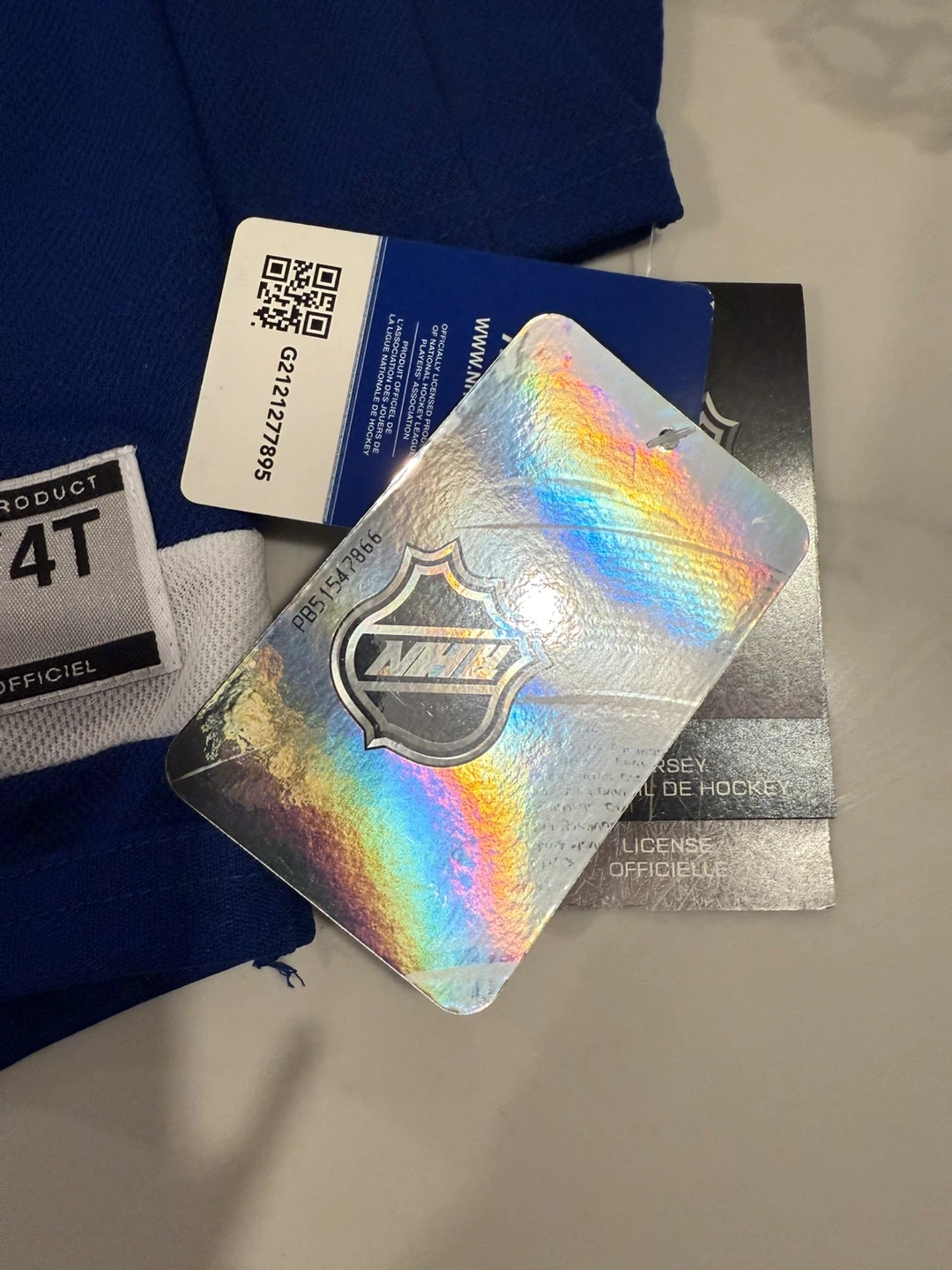 I'm selling a brand new Toronto Maple Leafs jersey featuring Tavares #91! It's a size 2T/4T and is an official licensed product. The jersey is blue with white accents and the classic Leafs logo. Perfect for your little hockey fan!