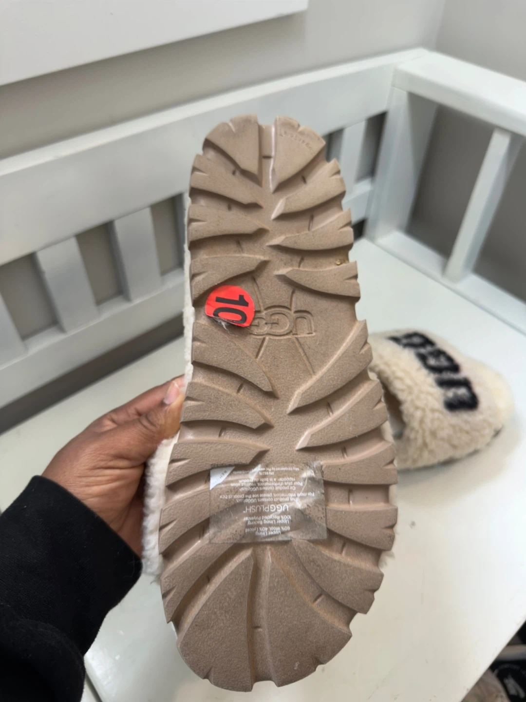 Selling a pair of UGG Fluff Yeah slides in a size 10. They're super comfy and in great condition! The fluffy texture is so cozy, perfect for wearing around the house. The UGG logo is prominently displayed on the strap. These are a stylish and comfortable choice for everyday wear